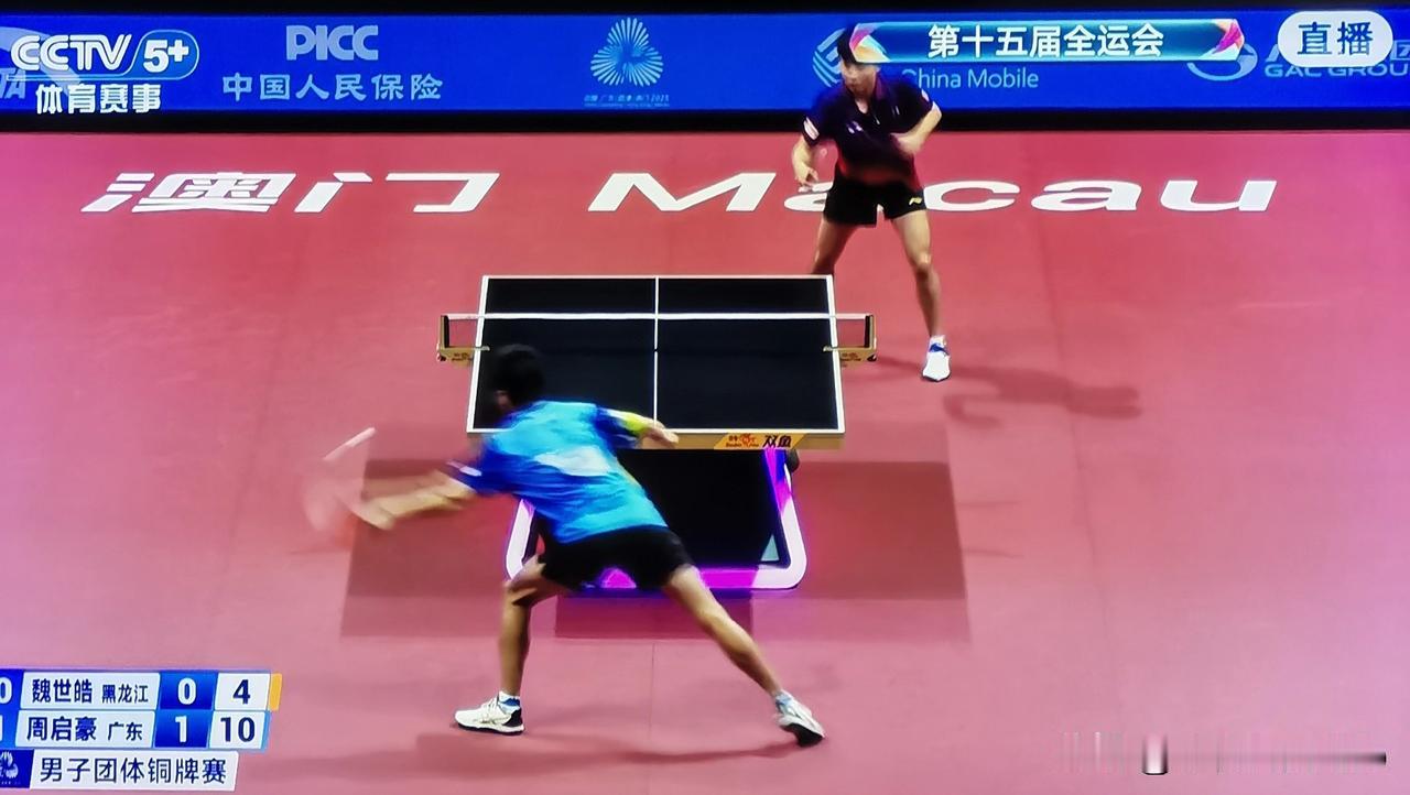 周启豪这打法也太邪乎了吧!上午广东与黑龙江铜牌争夺战,双打广东先下一城。第二盘单打广东周启豪对黑龙江魏世皓。第一局被周启豪率先拿下。第二局魏世皓通过发接发的变化很快以4:1领先。魔幻却开始了:11:4领先的魏世皓突然哑火,眼睁睁被周启豪打了一个10:0、以11:4拿下此局,大比分以2:0领先。虽然之后扳回一局,但最终被周启豪以3:1为广东队赢下第二分。 值得炫耀的是,比赛过程中周启豪炫了一把“魔幻”,为对方放了三次高球,结果,完胜对方。 行内人说,放高球是最幸福的,打高球是最痛苦的! 比赛还在进行中。