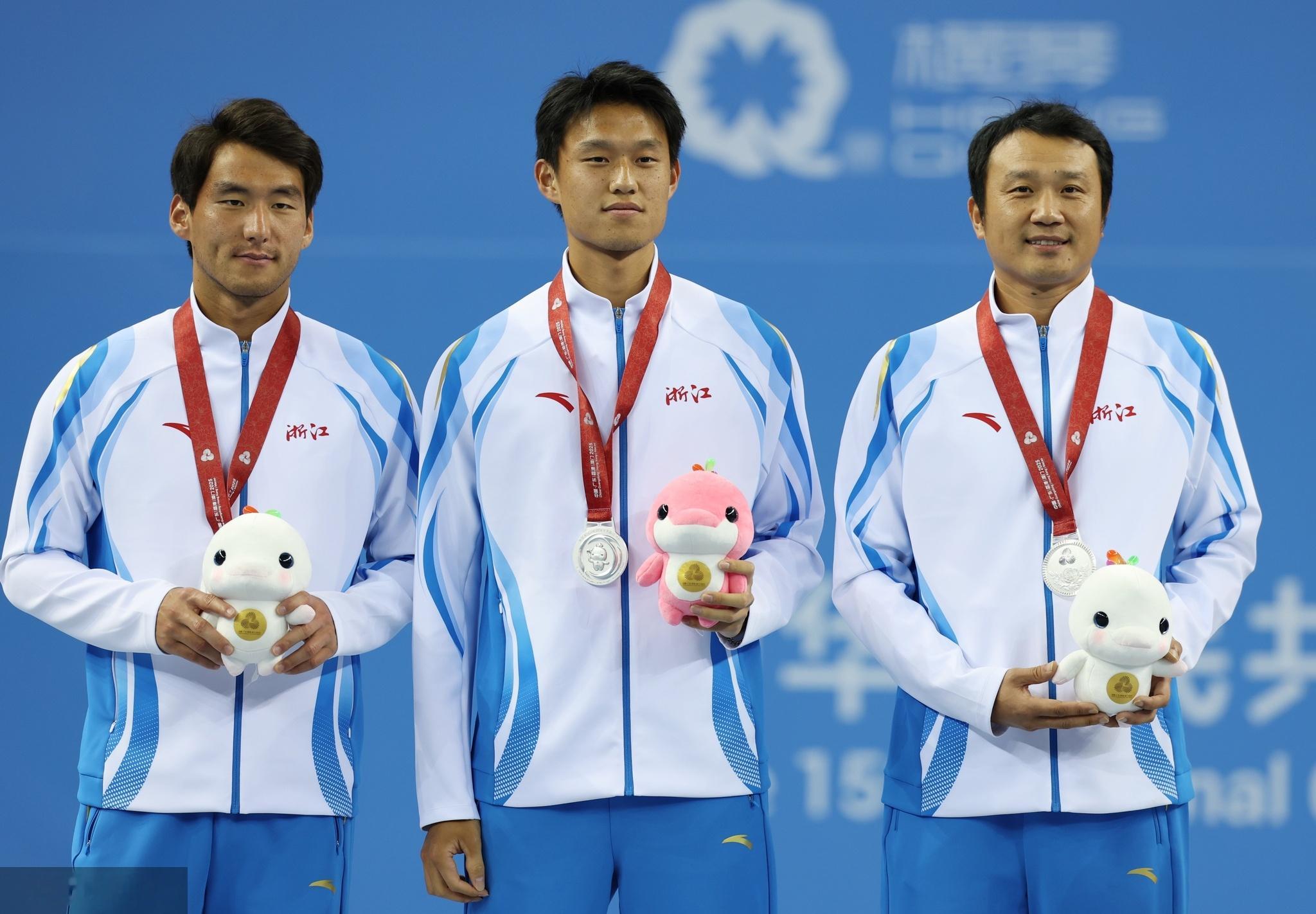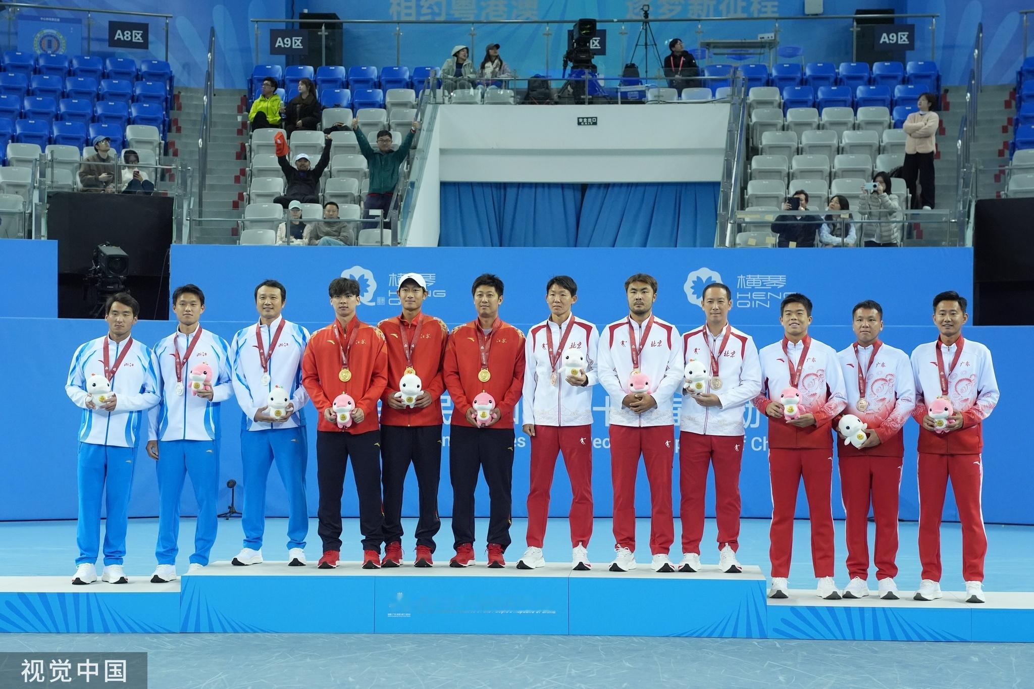 男双颁奖仪式图。金牌:孙浅/唐盛(江苏)银牌:布云朝克特/郑展(浙江)铜牌:曾姚杰/杨子江(广东) 崔杰/特日格乐(北京)