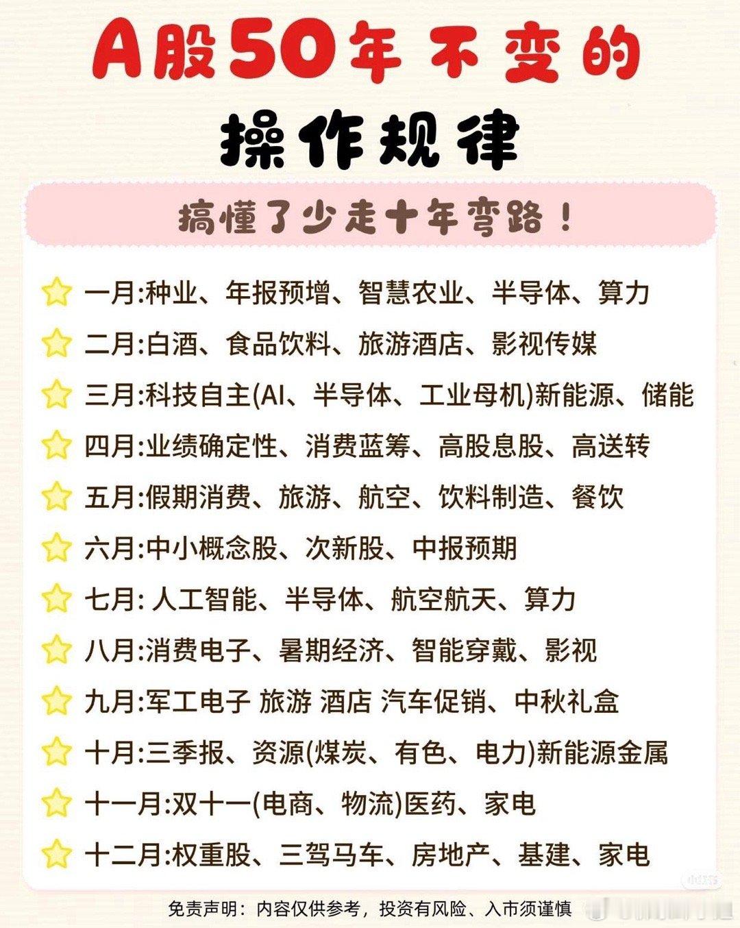 A股每个月的热点板块:一月:种业、年报预增、智慧农业、半导体、算力;二月:白酒、食品饮料、旅游酒店、影视传媒;三月:科技自主 (AI、半导体、工业母机)、新能源、储能;四月:业绩确定性、消费蓝筹、高股息股、高送转;五月:假期消费、旅游、航空、饮料制造、餐饮;六月:中小概念股、次新股、中报预期;七月:人工智能、半导体、航空航天、算力;八月:消费电子、暑期经济、智能穿戴、影视;九月:军工电子、旅游、酒店、汽车促销、中秋礼盒;十月:三季报、资源 (煤炭、有色、电力)、新能源金属;十一月:双十一 (电商、物流)、医药、家电;十二月:权重股、三驾马车、房地产、基建、家电。图片开头点明这是“A股50年不变的操作规律”,并表示“搞懂了少走十年弯路”。最后有免责声明:“内容仅供参考,投资有风险、入市须谨慎”。