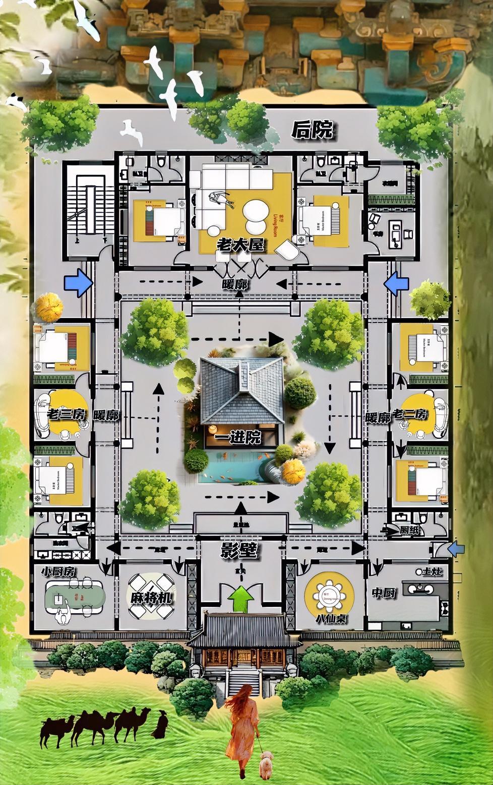 多年以后回头看,一进式大合院,也是中国式爷们儿的小骄傲,858㎡太多通俗,特殊有两点,一是老大家有后院,厨房有菜院小柴门! 前者的传统的价值,后者吃得上带露水的蔬菜! 布局上看,前排四房是,一大家族的共享空,讲究的烟火气。中间一进院最大器,讲究的意境,给全家人提供十足的情绪价值!最后面,简约版独立二居室,私享三套房。 说大话,花园是大家的梦想,保留各自的私生活! 布局很诙谐,动线有技巧,这就足够让大伙儿喜欢四合院的原因,为啥? 自建房能嘚瑟,凭自己喜好,打造出尘脱俗的生活方式,就是静如,禅意与洒脱,动如人间烟火气,即保留万家灯火氛围,又有穿梭山水与市井之间的归属。 我眼里合院,一亩三分地里闹腾出,多彩的生活,一静一动,讲布局,一仙一俗,讲韵味,把超大平层,唱活了! 四合小院是官方正式用语,说起来文绉绉的。 自建房是底层人民说的话,江湖气更重! 你觉的哪个话头,对头!