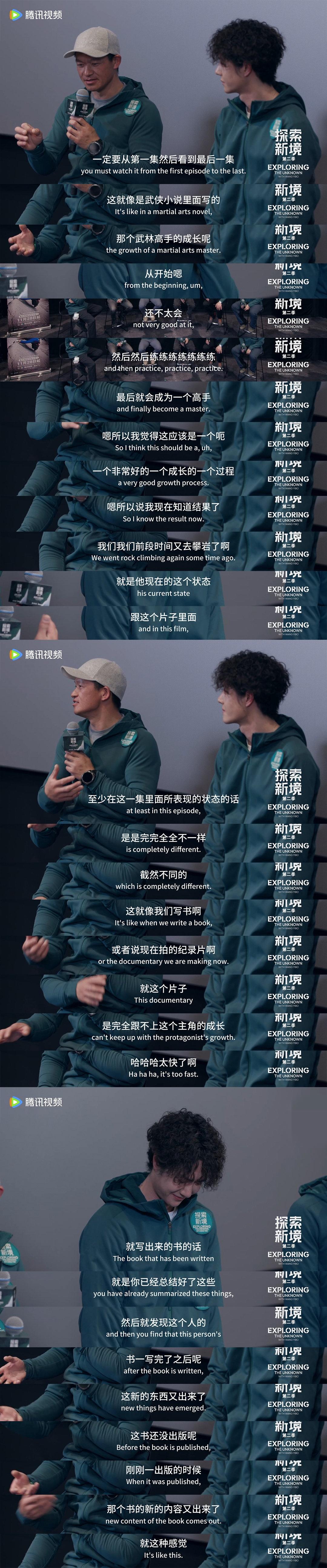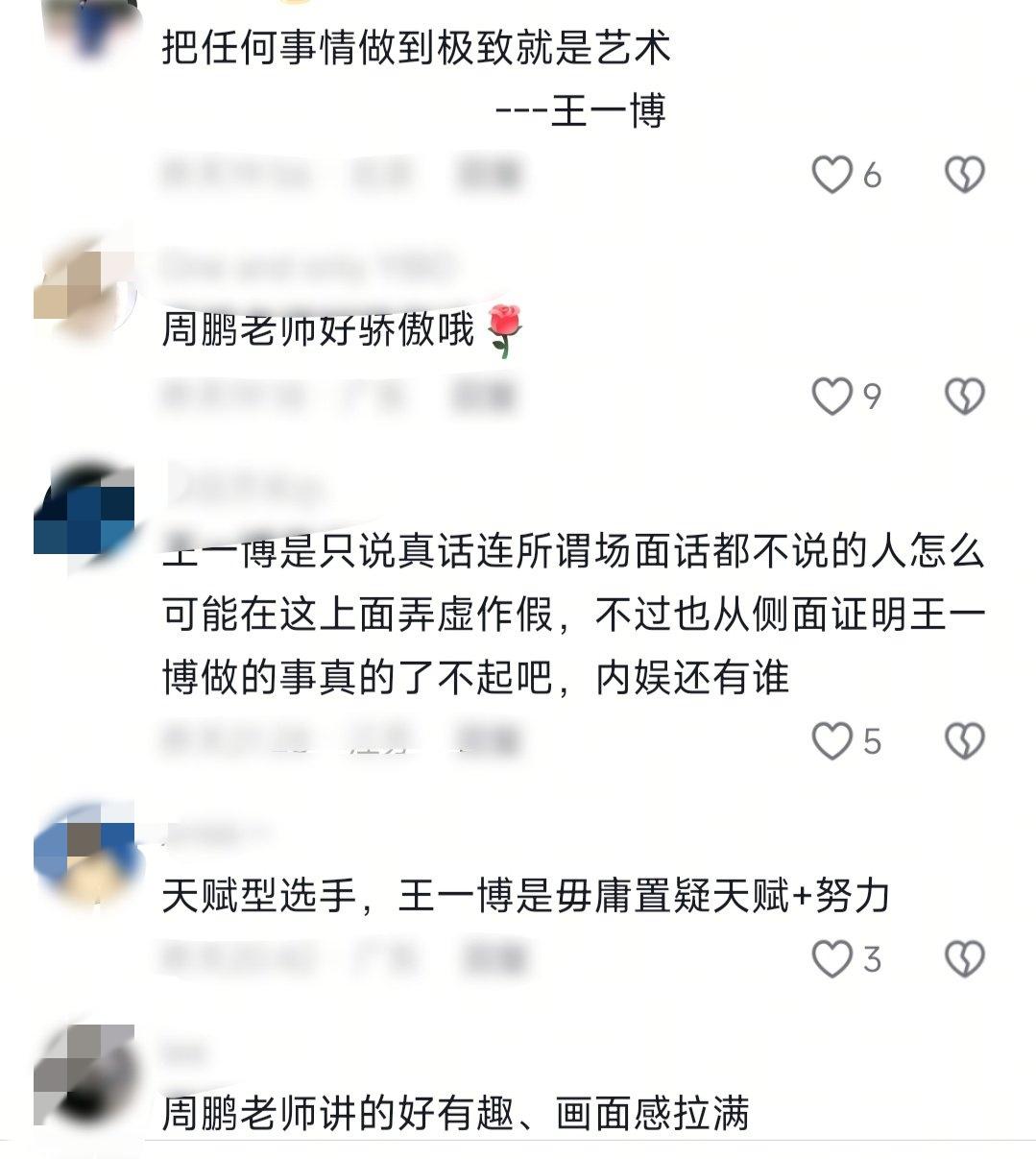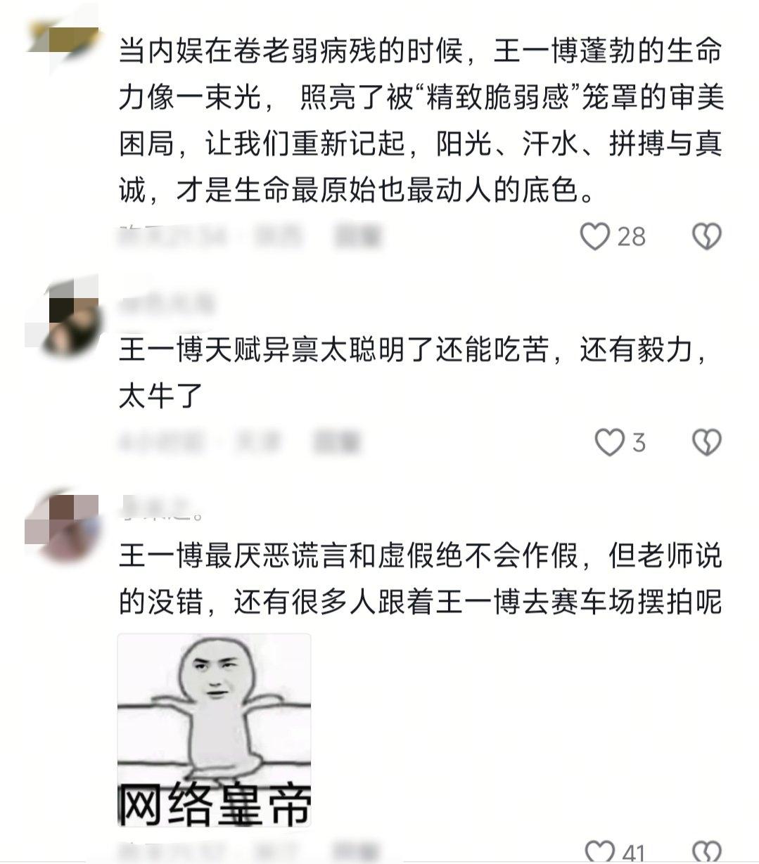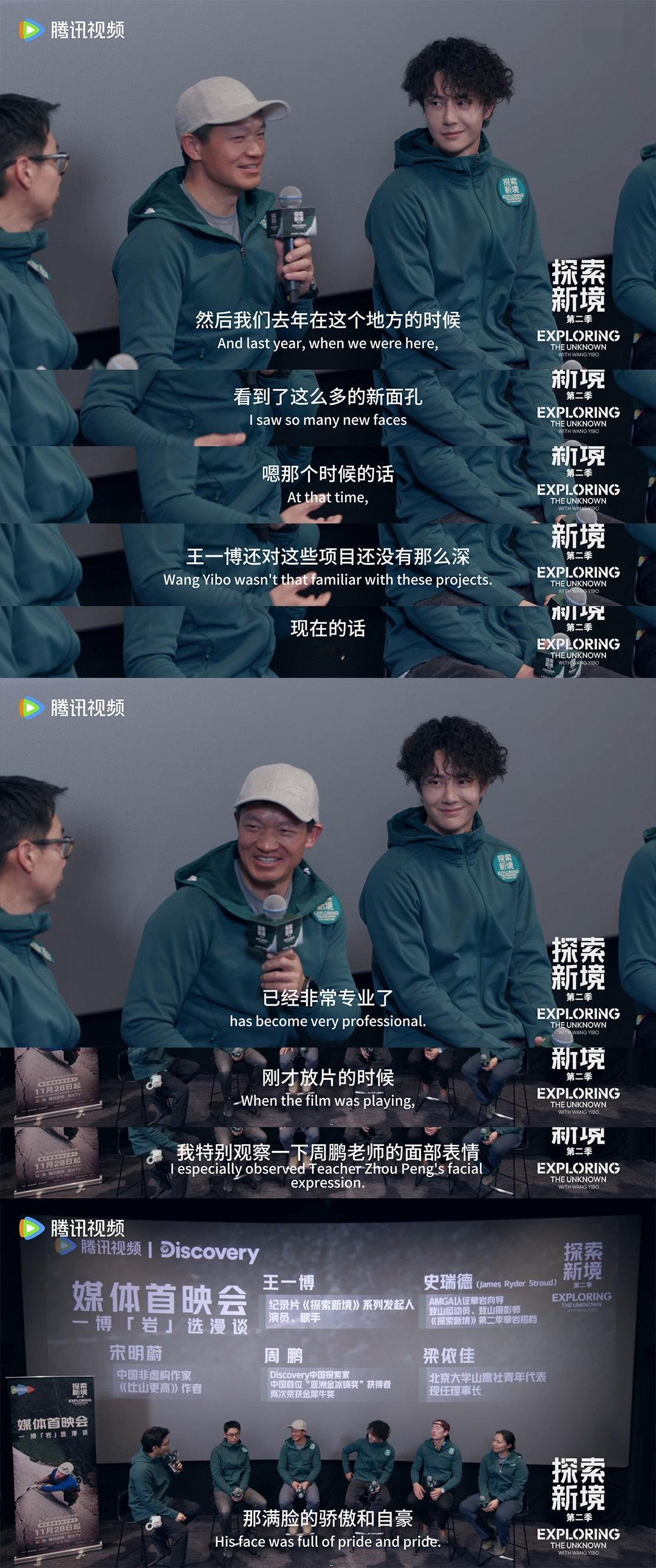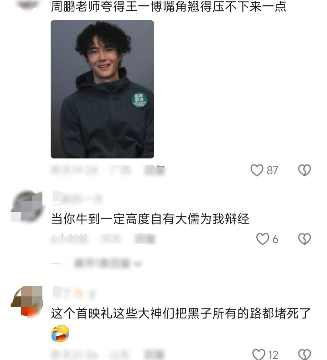 和王一博合作过,很难会不被他的人品天赋实力敬业所折服。 《探索新境》第一季中就和王一博合作过的周老师在《探索新境2》的首映会上,像看着自己最出息的关门弟子一般…“老怀欣慰”地夸夸不停。说王一博“像武侠小说里写的武侠高手的成长”,还是成长速度超快的那种!“就这个片子完全跟不上主角的成长!”[捂脸] 另一位作家更是现场为王一博“辟谣”:王一博是“真爬、真的热爱、真的训练”! 业内纷纷现场为王一博“反黑”,不知道那些满口谎言的黑子们看到了作何感想? 王一博正如网友所言:当你牛到一定高度,自有大儒为我辩经! 王一博自身的天赋实力、坚韧、豁达和每一次成就,都是对黑子最好的反击。 王一博,实实在在毫不掺水的“牛”!!! 王一博