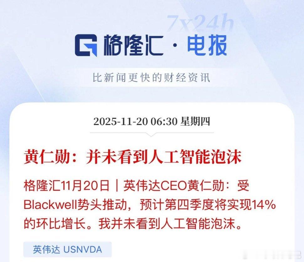 利好出炉,英伟达业绩强劲势头,美联储10月纪要“内讧”分歧,美股三大指数尾盘拉升,全线收涨,美元大涨突破100,黄金、白银跳水英伟达Q3的业绩和净利润均超市场预期,Q4展望强劲,英伟达涨2.85%,市值站上4.5万亿美元,盘后更是一度涨幅超6%,美联储10月会议纪要显示,美联储内部官员对12月降息分歧严重,若干官员表示12月降息是合适,很多官员表示12月降息可能不合适,会议纪要公布之后,美联储12月降息的概率直接跌破40%,只有36.2%,美联储传声筒表示,12月投票结果将非常胶着,会议纪要显示鹰派占据上风,叠加数据缺失导致降息概率大降,美股三大指数全线收涨,指数尾盘拉升,纳指涨幅0.59%,热门美股英伟达涨幅2.85%,谷歌涨幅3%,黄仁勋icon表示并未看到人工智能的泡沫。