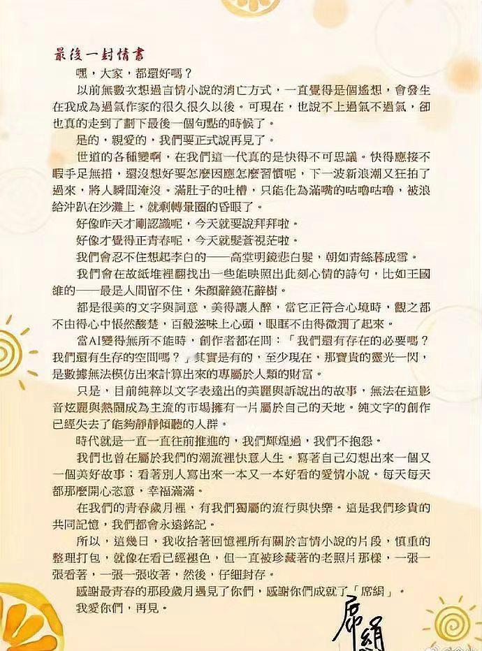 席绢发文宣布封笔 知名言情小说家席绢在11月19日发表长文《最后一封情书》,宣布封笔,这一决定不仅让无数书迷感到惋惜,也让整个文学界为之震动。 席绢自上世纪90年代起便以清新细腻的文笔风靡华语读者群,代表作如《上错花轿嫁对郎》《交错时光的爱恋》等,深受广大读者喜爱。 然而,近年来她的新作越来越少,直到此次正式宣布封笔。她在文中表示:“真的走到了划下最后一个句点的时候了”,并感谢读者多年来给予的支持和陪伴。 席绢的封笔不仅是个人职业生涯的终结,更是言情小说这一文学体裁面临挑战的一个缩影。随着网络文学的兴起,传统纸质书籍阅读习惯的改变,以及读者口味的变化,越来越多的传统作家面临转型的压力。