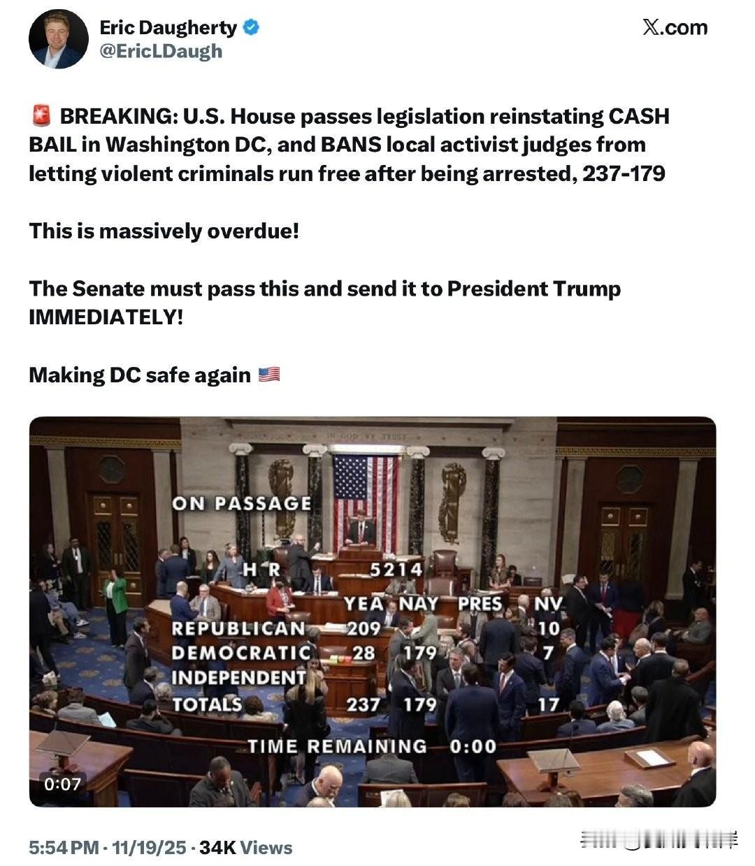 突发消息:美国众议院通过立法,恢复华盛顿特区的现金保释制度,并禁止地方激进法官在暴力罪犯被捕后将其释放。 投票结果为:237票赞成,179票反对。 这实在是太迟了! 参议院必须通过这项法案,并立即送交川普总统签署! 让华盛顿特区再次安全!