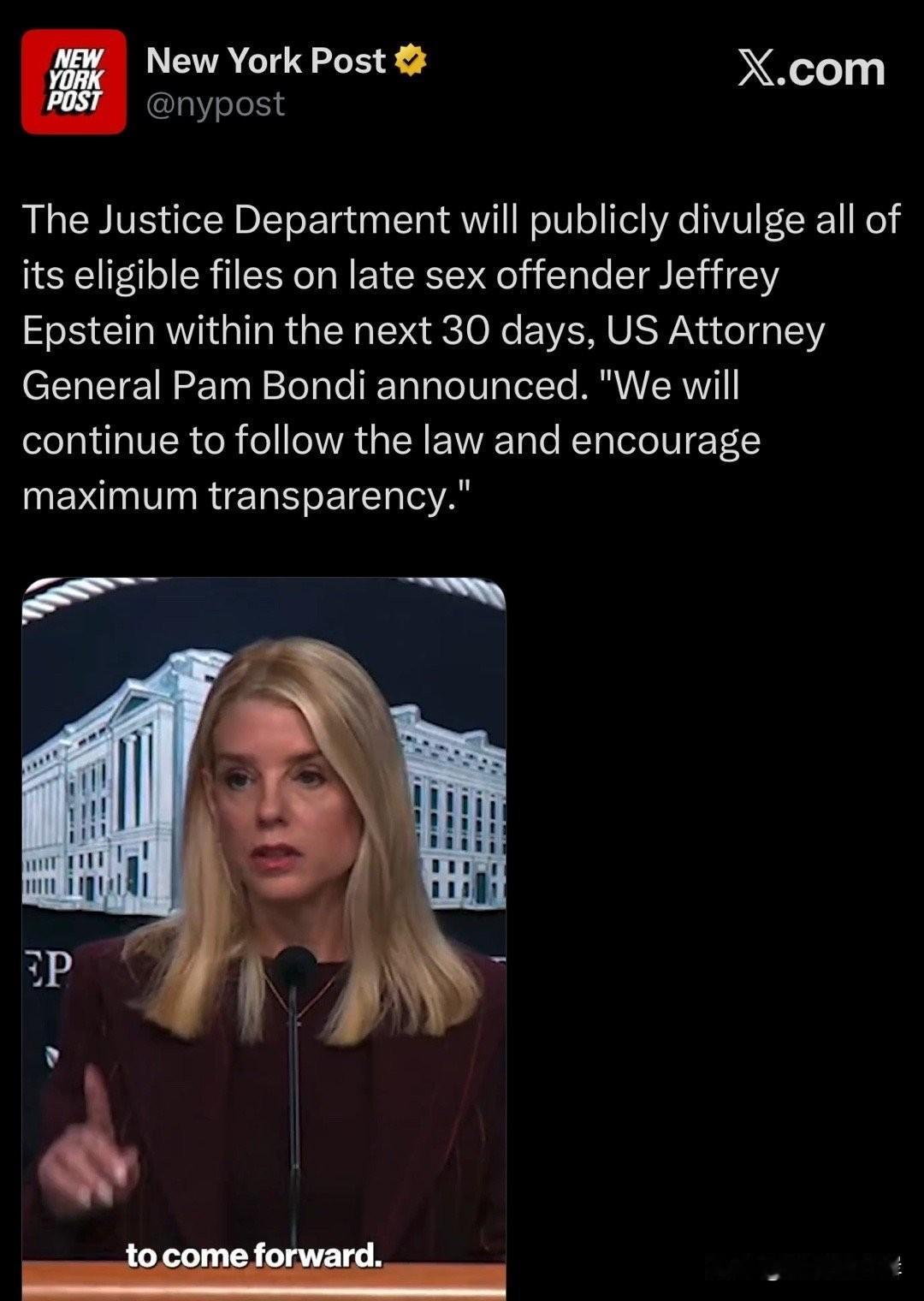 美国司法部长Pam Bondi宣布:“我们将在未来30天内公开所有符合披露条件的、关于已故性犯罪者Jeffrey Epstein的司法部档案。我们将继续依法办事,并推动最大限度的透明度,鼓励知情人士站出来。”