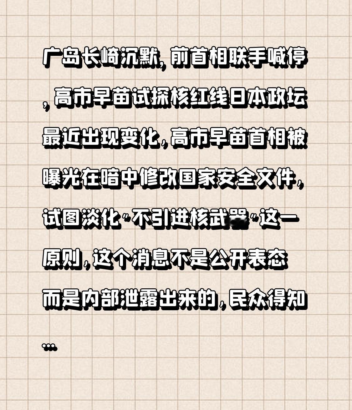 广岛长崎沉默,前首相联手喊停,高市早苗试探核红线 日本政坛最近出现变化,高市早苗首相被曝光在暗中修改国家安全文件,试图淡化"不引进核武器"这一原则,这个消息不是公开表态而是内部泄露出来的,民众得知后立即引发强烈反响,因为这个原则从1967年确立以来已延续近六十年从未改变,现在突然出现松动迹象让所有人都感到不安。 这个原则不是随便决定的,当年佐藤荣作提出来,后来国会正式通过,变成国家的政策,背后有广岛和长崎的惨痛记忆,老百姓心里一直认可这件事,2022年的新安保文件还明确写着要坚持三原则,现在却说要改变,等于是自己打自己的脸,很多人觉得这不只是调整政策,而是整个态度都变了。 两位前首相都站出来了,岸田文雄在广岛发表讲话,野田佳彦在长崎表达意见,他们虽然都是自民党出身,但属于不同派系,虽然没有直接点名高市早苗,但意思谁都明白,就是不能触碰这个底线,岸田说自己的态度没有改变,野田提到民众的不安正在扩大,话讲得不多,分量却很重,这种党内重要人物一起表态的情况很少出现,说明事情真的不小。 高市提出的想法是搞核共享,就是让美国在日本部署核武器,但控制权在美国手里,日本只负责日常看守,从法律角度看这不叫拥有核武器,实际上等于引进了核武器,专家之前说过,日本自卫队的装备其实可以对接核武器,技术上完全可行,问题在于这件事一旦做了,道德上会遭到批评,政治上也会难以收场。 广岛和长崎的官方没有发表意见,但两地的市长这些年持续在联合国发声,反对使用核武器,日本首相岸田与前首相野田特意到两地讲话,实际上是在借助地方平台表达立场,民间组织发起一项写信活动,吸引十几万人参与,信件内容记录普通人对核武器的担忧,这种无声的压力比任何口号都更有效果。 美国方面没有明确表态支持,拜登政府虽然提到"延伸威慑",但并未允许日本接触核武器,韩国和中国也没有回应,但日本专家明白,如果日本真的越过这条线,亚洲各国之间的无核信任就会破裂,这一步一旦迈出,就很难回头。 自民党内部出现分歧,稳健派和鹰派争论得很激烈,有人提出警告,如果日本参与核共享计划,就会从受害者的角色转变成参与者,导致国家形象受损,这个说法虽然还没有在国会正式讨论,但已经在媒体和智库之间传开,大家都在关注高市究竟会不会推动这件事。高市早苗内阁 高日早苗 高市早苗演技派 高木早苗 日本早亡 高市首相 高早苗
