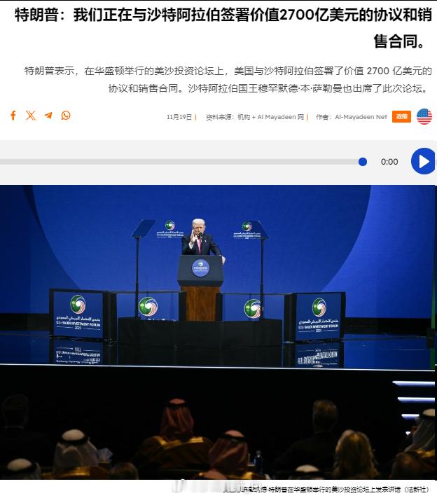特朗普在华盛顿的美沙投资论坛上表示,美国与沙特阿拉伯签署了价值 2700 亿美元的协议和销售交易,其中包括一些“美国最先进的武器”,并暗示可能包括正在研发的F-47战斗机。