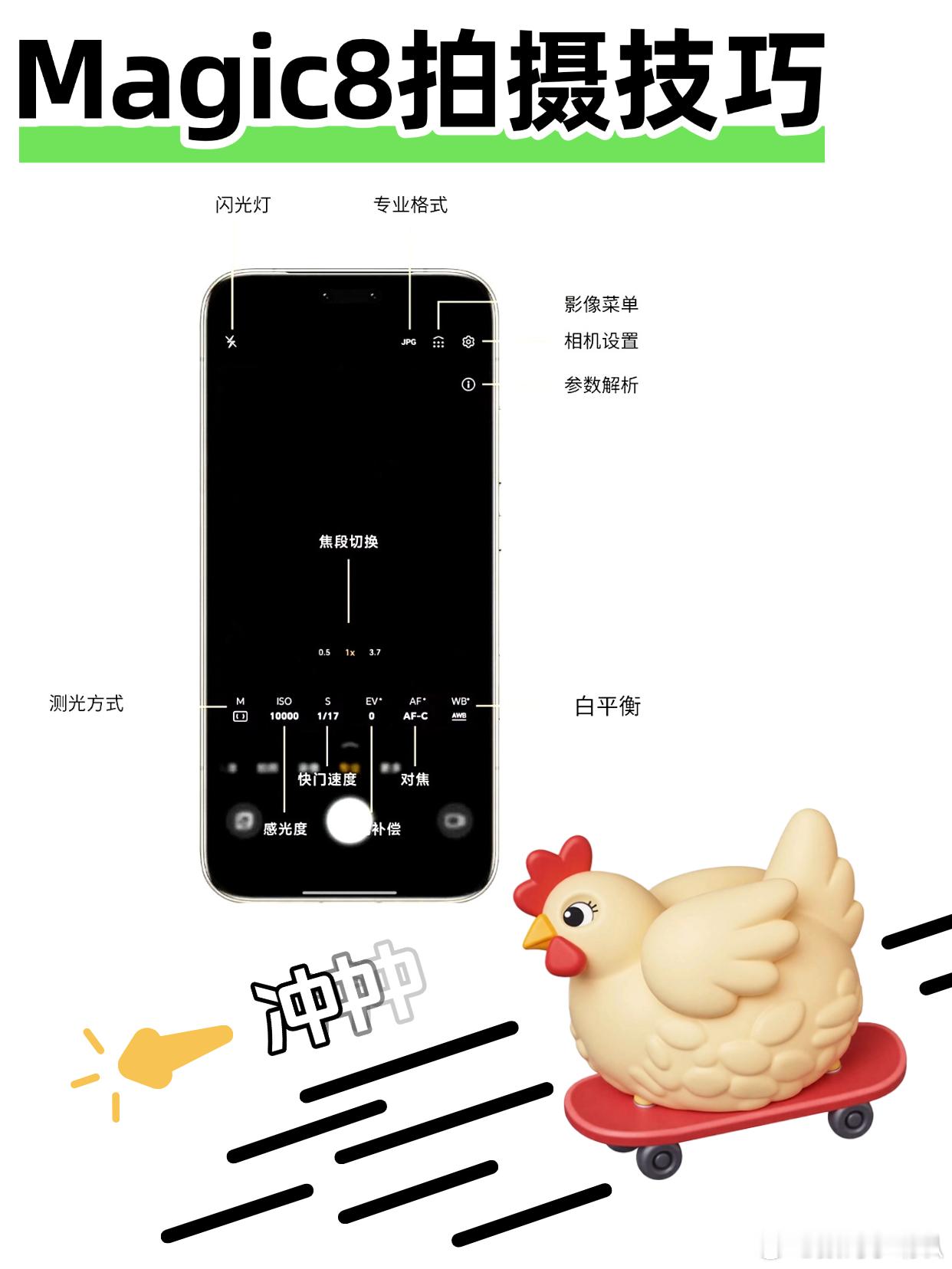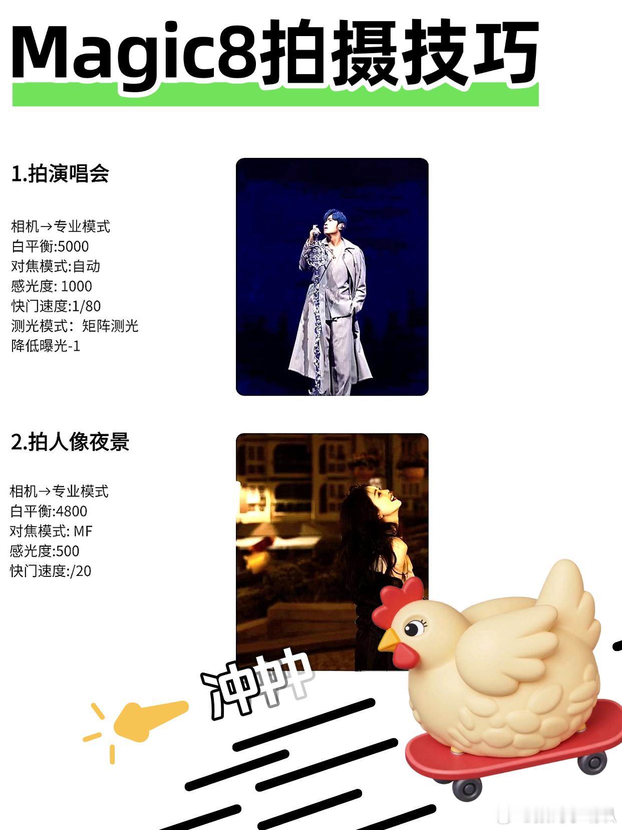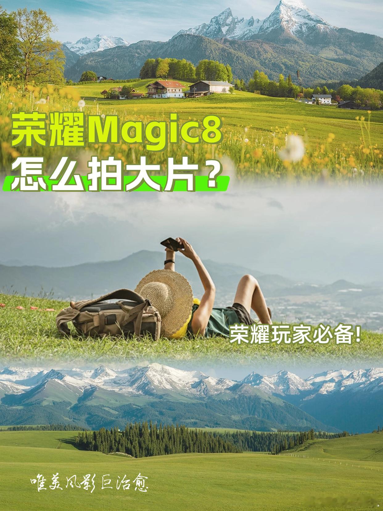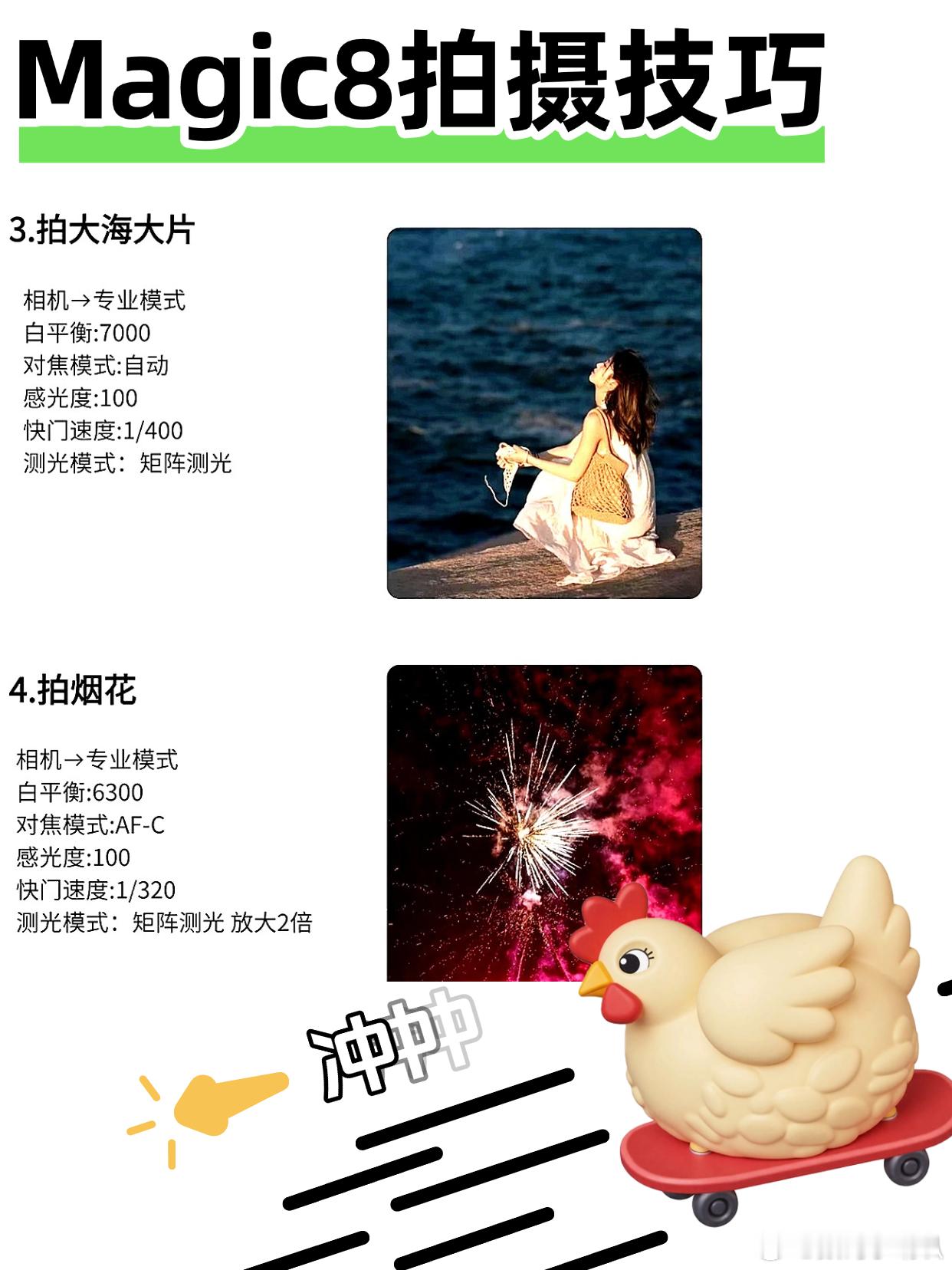 荣耀Magic8摄影全攻略|从零基础到出片大神总有人说拍照要靠技术?荣耀Magic8直接给你开了外挂!💖💖荣耀Magic8标准版相比其他家最大的优势就是长焦了,这个优势一定要发挥出来!👉 夜景神操作:晚上遛弯想拍江景,打开“AI超夜神”模式,2亿像素长焦+智能防抖,对岸霓虹、水面波光、树叶纹理全清晰,朋友看了直呼“这真是手机拍的?!”👉 场景智能指导:侧边AI键一键召唤“灵感帮拍”,自动推荐构图和姿势!拍花海该蹲低还是侧仰角,手机实时提示,再也不用对着镜头僵成木头人~👉 抓拍不糊片:孩子奔跑、宠物卖萌,鹰眼抓拍4.0每秒连拍10张,动态瞬间全拿捏!“差一点拍清楚”的遗憾?不存在的!“专业模式参数表:小白秒变摄影课代表”📸 拍月亮:M点测光+ISO80+S1/400+白平衡6200(晚上试过,月亮纹理清晰到像在眼前!)📸 拍星空:M矩阵测光+ISO100+S1/100+白平衡4200(记得用三脚架,星空能拍出细碎星光!)📸 拍演唱会:M点测光+ISO1000+S1/100+AF-C对焦(台上爱豆的汗珠都能抓清楚!)(更多场景参数见图表,建议存图跟着调!)“人像黑科技:自带精修buff,原图直出也能打”▪️AI人像优化:皮肤质感保留细节,连眼神光都自然提亮,背景虚化像单反!▪️AI追色一键换风格:浪漫蓝调、暖色夕阳…模板库超全,普通照片秒变电影截图!▪️修图一句话搞定:模糊老照片AI修复,杂乱背景AI消除,动动嘴就能换天空换场景!✨总结:懒人党:AI全自动模式,抬手就拍,修图动嘴不动手!技术流:专业参数任你调,星空演唱会全搞定!荣耀Magic8的长焦+AI组合,真的让拍照变成“有手就行”的快乐事~