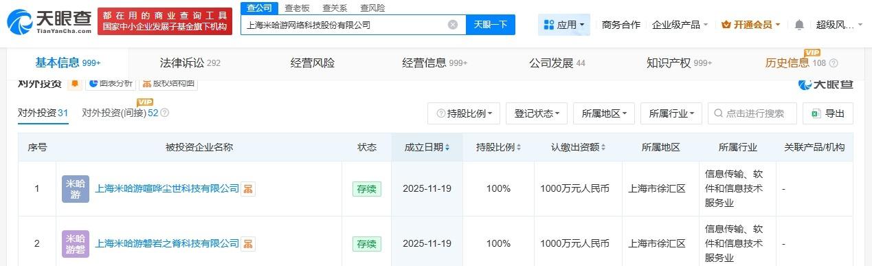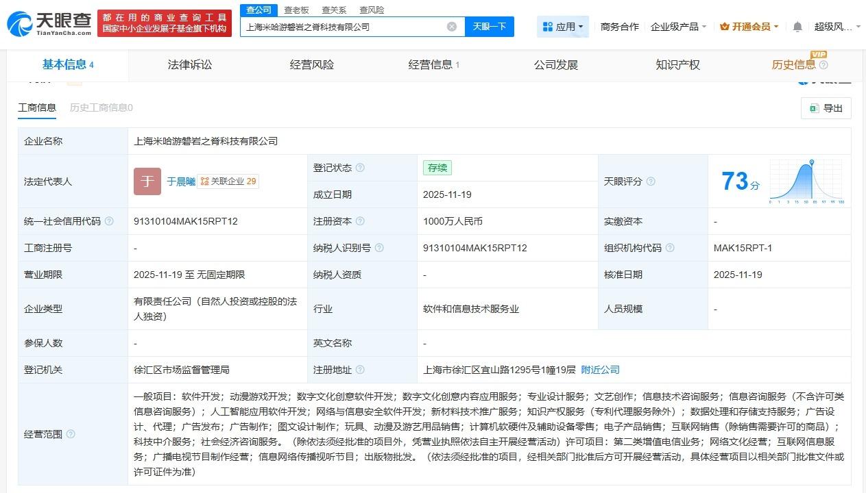 米哈游在上海成立两家科技公司 天眼查工商信息显示,近日,上海米哈游喧哗尘世科技有限公司、上海米哈游磐岩之脊科技有限公司成立,法定代表人均为于晨曦,注册资本均为1000万人民币,经营范围包括数字文化创意软件开发、数字文化创意内容应用服务、广播电视节目制作经营等。股东信息显示,上述两公司均由上海米哈游网络科技股份有限公司全资持股。 天眼查信息: