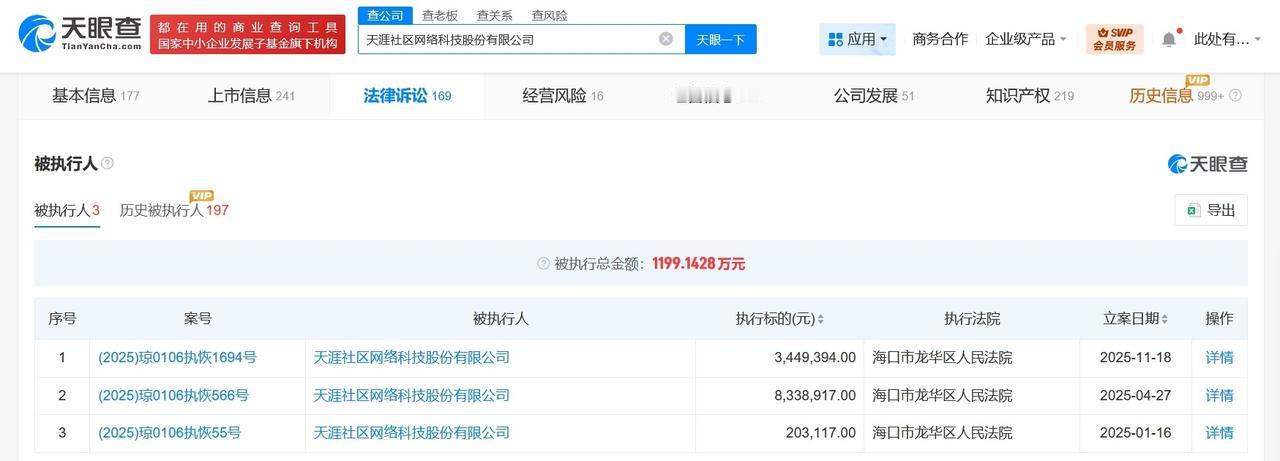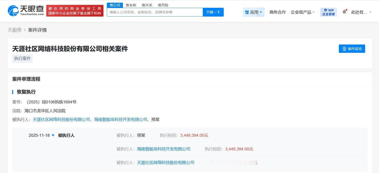 天涯社区及创始人邢明等被恢复执行344万 天眼查App显示,近日,天涯社区网络科
