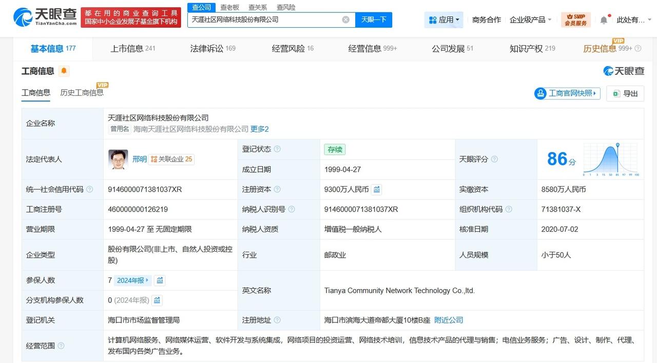 天涯社区及创始人邢明等被恢复执行344万 天眼查App显示,近日,天涯社区网络科技股份有限公司、海南智能岛科技开发有限公司、邢明新增一则恢复执行信息,执行标的344万余元,执行法院为海口市龙华区人民法院。 天涯社区网络科技股份有限公司成立于1999年4月,法定代表人、董事长兼总经理为邢明,注册资本9300万人民币,经营范围含计算机网络服务、网络媒体运营、软件开发与系统集成,网络项目的投资运营、网络技术培训,信息技术产品的代理与销售等。股东信息显示,该公司由邢明、达孜研悦管理咨询有限公司、江伟强等共同持股。天眼风险信息显示,该公司现存3条被执行人信息,此外,还存在多条失信被执行人(老赖)、终本案件及股权冻结信息。 天眼查信息: