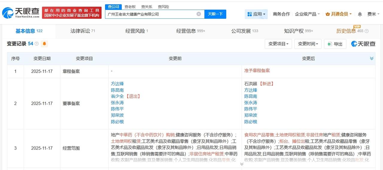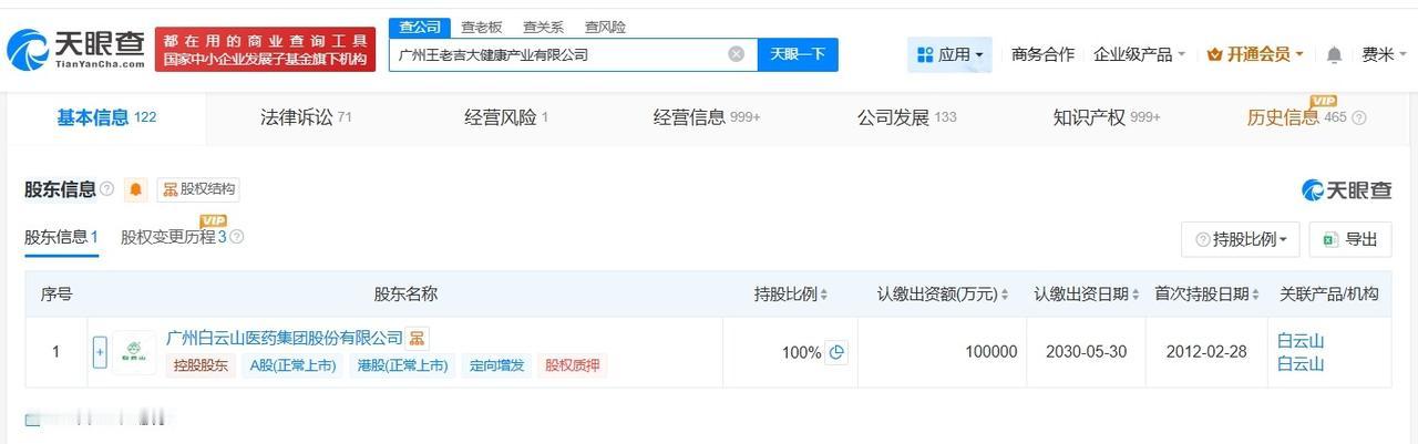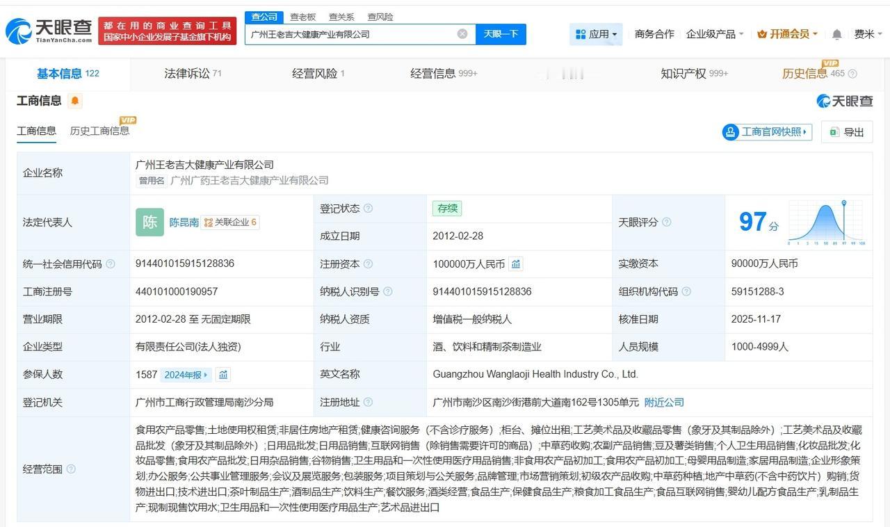 王老吉关联公司增资至10亿增幅约11% 天眼查工商信息显示,近日,王老吉关联公司广州王老吉大健康产业有限公司发生工商变更,注册资本由9亿人民币增至10亿人民币,增幅约11%,同时发生高管变更。 广州王老吉大健康产业有限公司成立于2012年2月,法定代表人为陈昆南,经营范围包括食用农产品零售、土地使用权租赁、非居住房地产租赁等。股东信息显示,该公司由白云山全资持股。 天眼查信息: