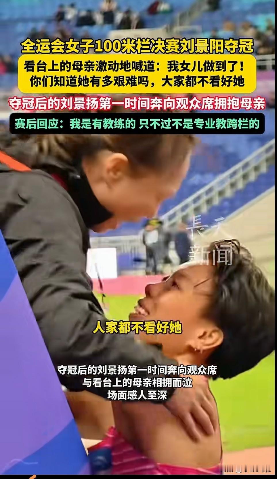 1997年生的广东姑娘刘景扬,现在是全运会女子100米栏冠军,但你知道吗?这姑娘为了这块金牌足足跑了20年,前两届全运会连决赛都没摸着,还摔过好几次大跟头。 小学二年级,她就开始练田径,一练就是20年,专攻100米栏也有13年了。 每天大清早,训练基地的跑道上,准能看见她,要么反复练过栏动作,要么绑着沙袋冲冲刺,练到腿抖的站不稳才肯歇。 可运气就是不站在她这一边,前两届全运会,她拼尽全力,也没闯进决赛,看着队友拿奖退役,自己却没半点成绩,心里急得发慌,但从没说过不练了。 更糟糕的是伤病找上门,上届全运会后,她身体扛不住了,只能从上海回广东疗伤。 康复期间不能高强度训练,她就对着镜子抠过篮的小动作,翻着自己的训练录像琢磨哪里错了,体能跟不上,就从慢走慢跑,一点点恢复。 跟着三级跳教练麦国强练了四年,别人都笑她“野路子跨栏”。 跨栏选手跟着三级跳教练蹦沙子、练跨步跳,教练让蹦多少组就蹦多少组,慢慢把三级跳的爆发力融进跨栏里后成冲刺,越来越有劲。 2025年,算是她的过山车年,上半年状态还行,拿了两站全国大奖赛冠军,还进了亚锦赛国家队,可惜亚锦赛只拿了第五。 8月全国锦标赛更倒霉,预赛跑出个人最好成绩13秒03,眼看要冲冠军,结果最后两个栏没踩稳,直接摔在跑道上,眼睁睁看着冠军飞了。 全运会决赛那天11月19日,在广东奥体中心,刘景扬站在第四道,他的身边有夺冠热门吴燕妮,卫冕冠军林雨薇,赛前没人觉得他能拿冠军。 发令枪响她起跑最慢,看着对手一个个冲在前面,她没慌,把前半程稳着来,后半程把蹦沙子的狠劲使出来。 过栏越来越顺,冲进冲刺越来越快,她一步步抄上去,从第四追到第三,再到第二,最后冲线时直接冲到第一! 然后疯了似的冲到看台,抱着妈妈哭成泪人,她妈妈哽咽着喊“没人看好她,可她做到了!” 赛后有人说她是“黑马”,28岁的她用20年的坚持,从连决赛都进不去的陪跑者,变成了全运会冠军,那些摔过的跟头,流过的汗,受到的质疑,最后都变成了金牌上的光,这姑娘总算没辜负自己。