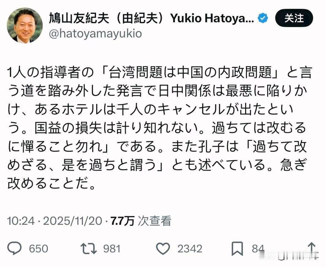 高市拒不收回错误言论,日本前首相鸠山由纪夫气得引用孔子名言奉劝高市。他说“过则勿惮改”,又说“过而不改,是谓过矣”。上面那句话是孔子说的,意思是犯错不怕,及时改正就好了,知错而不改,才是真正的错误。高市眼下就是这样的,她现在肯定知道自己错了。但碍于面子,高市却死活不道歉,不认错。此举的后果,就是给日本带来绝大的损失,目前,中方已经开启了不少的反制措施。就拿旅游来说,据说有一家酒店出现一千人取消预订的情况。日内国内有人大声悲呼,高市一张嘴,导致国家利益的损失无法估量。”希望高市能明白鸠山由纪夫的劝解,尽快纠错吧!