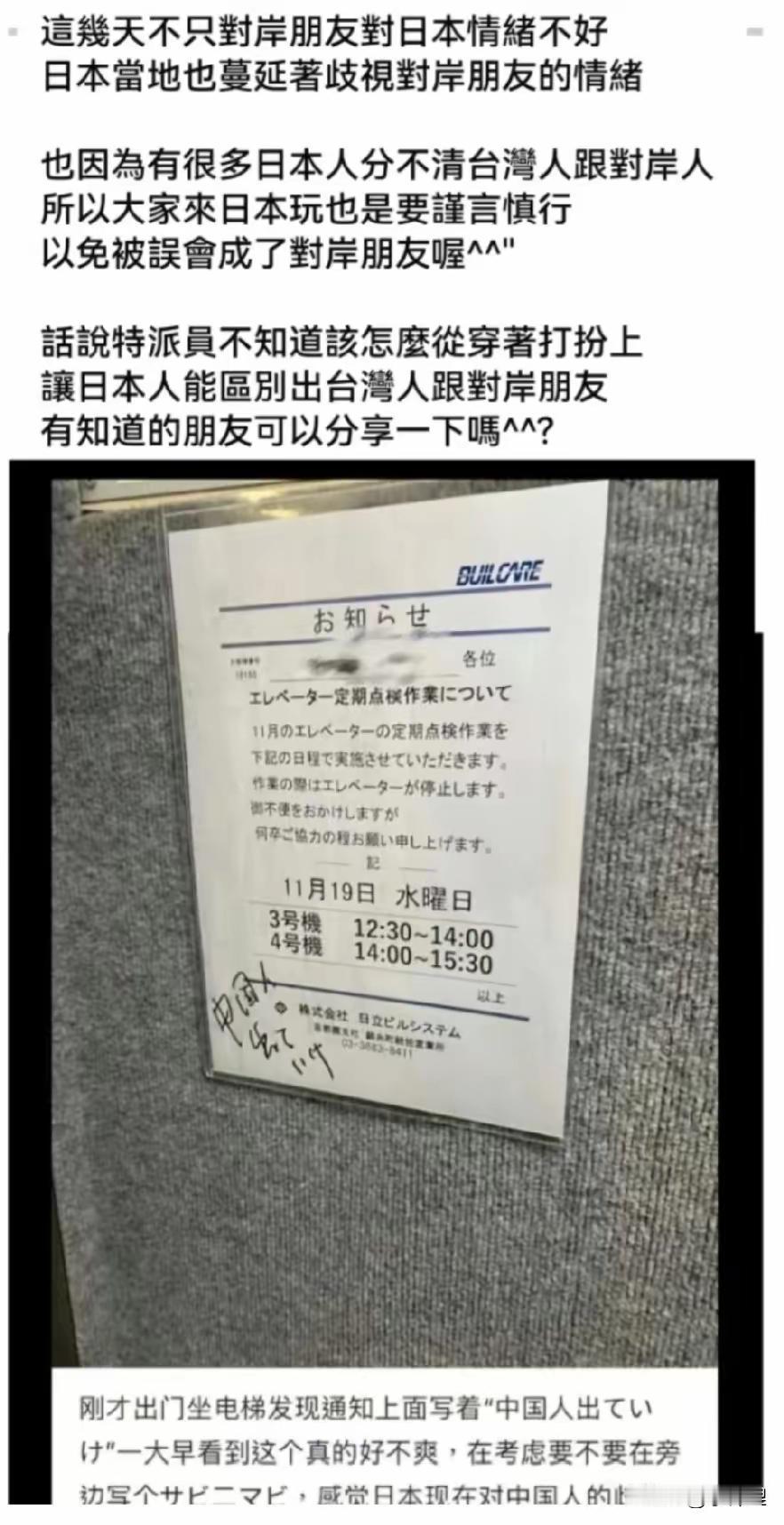 今天,住在日本的中国网友发帖称,他居住的地方,电梯通知栏上被人写了“中国人滚出去