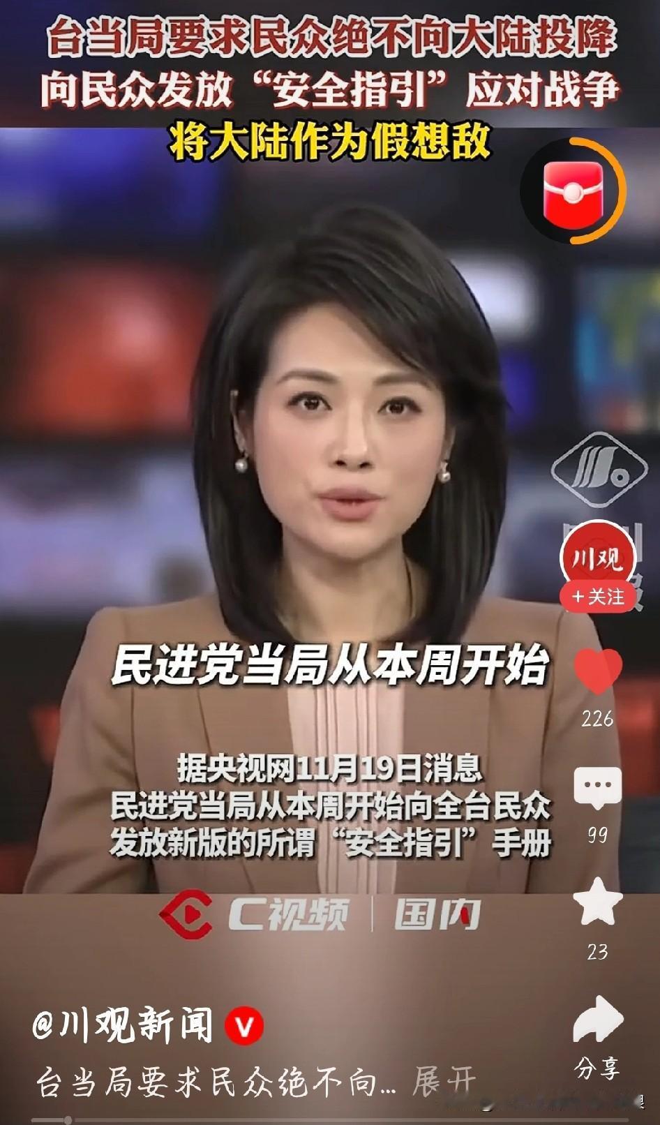 台当局最近搞出个笑话,发“民防手册”逼民众喊“绝不向大陆投降”,真是滑天下之大稽! 两岸本是一家人,哪来的“投降”一说?分明是“台独”分子为了谋私利,故意制造对立,把台湾民众绑上他们的“谋独”战车。他们一边拿着民众的钱讨好美国、跪舔日本,让台积电等核心产业被外人拿捏,一边让老百姓扛风险,连基本口粮储备都敷衍了事。 看看民意就知道,77%的台湾民众想两岸恢复交流,88%不愿关闭沟通管道,没人想打仗。“台独”分子的谎言骗不了人,统一是历史大势,不是几句口号就能挡得住的。别再搞政治表演了,害了台湾民众,最后只会被钉在历史耻辱柱上!两岸和平发展,才是大家真正想要的。台当局要求民众绝不向大陆投降 中国台湾省 图片截图于网络