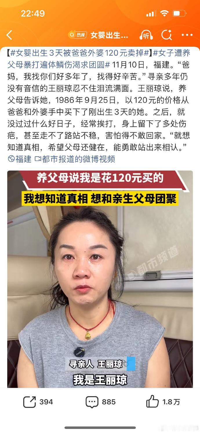 女生才出生3天就被爸爸和外婆120元卖掉,才花一个月的工资就买到一个女儿,有些人是真不配做父母。 这个女生叫王丽琼在网上寻亲,她说,从养父母口中得知,1986年9月25日,养父养母花了120元的价格从她爸爸和外婆手中买下了刚出生3天的她。 她从小就被养父养母给虐待,没过过一天好日子,动不动就要挨打。养父养母对自己不好…亲生父母又是把自己卖掉的…真的是哪边都是火坑啊,她原来的父母就真的缺这120块钱吗?能把她送走也不会是什么好的家庭。 她现在迫切的想要找到原来的亲生父母,就很不理解为什么还要找回去呢?你父母都卖掉你了,你还要他干嘛呢?你是被丢的,被亲生父母卖掉的。其他人寻亲是被卖掉的才去寻亲。从他们卖掉你那一刻就恩断义绝了,可能找到亲生父母会更失望吧。 不过之前在农村轻女重男,确实有生了女孩,要么卖掉要么扔掉要么莎掉。 建议别找了,余生好好爱自己,比什么都强。