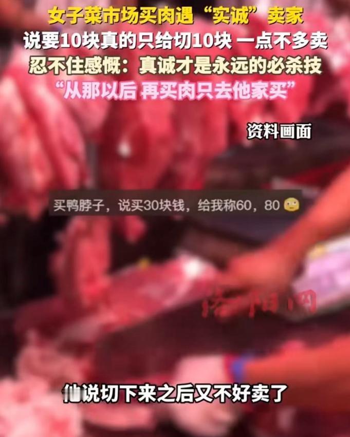 湖南,女子去买肉,提前说好买 10 块,但卖肉的大妈都会给她切 18 块甚至 20 块的肉。女子脸皮薄,大妈又说切下来之后就不好卖了,女子就只能认了!直到女子有一天换了一家卖肉的档口,忍不住感叹:真诚才是永远的必杀技! 如果你常去菜市场,多半经历过这种“软刀子切钱包”的场景:心里算好预算,准备稳稳买点晚餐材料,一个字都不敢多说,直接开口:“老板,切10块钱的肉”。 结果刀子一落秤一响,数字永远比你说的多,不是18,就是20,你说不要,人家给你来一句:“妹子,留点情面嘛”。你就哑火了,只能掏钱。 在湖南某个市场里,就因为这个“切多少”,两个摊位走出了两条截然不同的路,故事主角是一位脸皮不太厚的女士,她常去一位卖肉大妈那儿买肉,觉得大妈辛苦,能照顾就照顾。 刚开始也没什么,可时间久了,她发现问题越来越明显:她说“只要10块”,大妈的刀像长眼睛,一刀下去永远比需求多一大截。 上到秤盘,十块钱瞬间成了二十,你不愿意,大妈就开始她那套熟练的话术:“哎呀,这肉就这样一整块,真要给你切下来,剩下边角还怎么卖?你就帮帮忙嘛”。 市场吵闹、后面有人排队,这几句话像无形的绳子,把你捆得死死的,女士每次心里虽不舒服,但碍于面子,不好翻脸,只能吞下去。 这种“被安排”的感觉她忍了很久,直到有一天,她不再走向大妈,而是去了旁边新开的年轻夫妻档口,她还是那句:“帮我切10块钱的”。 年轻男人很爽快,一刀下去,秤上的数字跳到12元,多两块,说实话,大部分人都能接受,女士也准备扫码了。 结果那小伙子突然把肉抓回去,又重新修刀。女士都惊了:“哎你干嘛?都这样了还切?”小伙子头也不抬:“你要十块,我切多了就帮你修掉,多出来的你又没要。” 女士懵住了,在她去的大妈摊位,从来只有“往多了切,你帮我把整块拿走”。从没见过有人主动往少里切。 她忍不住复刻大妈那套说辞:“这样修下来碎碎的还能卖吗?”小伙子直接笑了:“为什么卖不掉?只有生意不行的人,才怕这些碎肉不好出手,所以才想方设法往顾客身上塞。 我家肉不愁卖,这些边角正好补到别人那份里,压根不浪费”,这一句像把窗户纸捅穿了。 原来所谓的“切多了就不能退”,根本不是事实,而是缺乏底气的老板,用来抓住顾客的借口,年轻夫妻敢按需求来,是因为他们相信自己的肉够好,生意不靠套路,而靠诚实。 渐渐地,大妈摊位前冷清了下来,顾客们嘴上不说,心里都记得那些“被迫多买”的不痛快,脚自然就迈去了不远处那对年轻夫妻的档口。 反倒是夫妻档位前常常排队,那位女士每次来市场,都会先买别的,再专程绕回来等他们切肉。 两块钱的差价,不会让人更富,但那份“你说多少我就给多少”的尊重,让人踏实,那不是肉的问题,而是信任的问题。 在这个讲究速度、套路横行的时代,太多人觉得占点小便宜才算聪明,逼顾客“多买一点”就能提高利润,却忘了信任只有一次,一旦被透支,再也补不回来。 而真正把生意做长久的,从来都不是那些让顾客不好意思拒绝的手段,而是那个能把12块切回10块的小动作,看着像少赚了几块,其实是在赢一段关系、一份安心、一种愿意回头的忠诚。 最终你会发现,不管是菜市场、职场还是任何商业场景,真正的“必杀技”就一个字,真。 真心、真诚、真材实料,永远比套路耐用。
