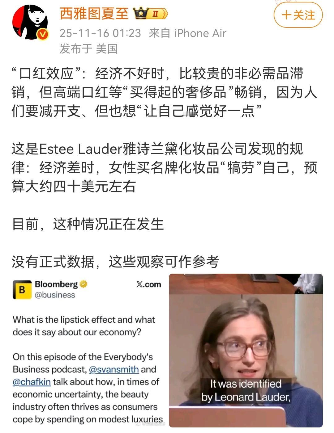 见微知著,小小口红可以映射经济大势。 (如图所示)口红效应是指在经济下行、居民收入减少时,口红等低价、非必需的“小奢品”销量反而会上升的经济现象。 类似一叶知秋的经济现象还有: - 裙摆效应:经济繁荣时,女性裙摆长度更短;经济衰退时,裙摆长度更长。 - 方便面效应:经济下行期,方便面等廉价、便捷的食品销量会上升。 - 榨菜指数:通过观察榨菜的销量变化来判断居民消费能力和人口流动趋势。榨菜销量增长依靠低收入和流动人口。 有网友通过大货车的特种机油消耗情况,就可以大致预判出全国经济形势,毕竟经济好的时候,货运量猛增,机油消耗就大。