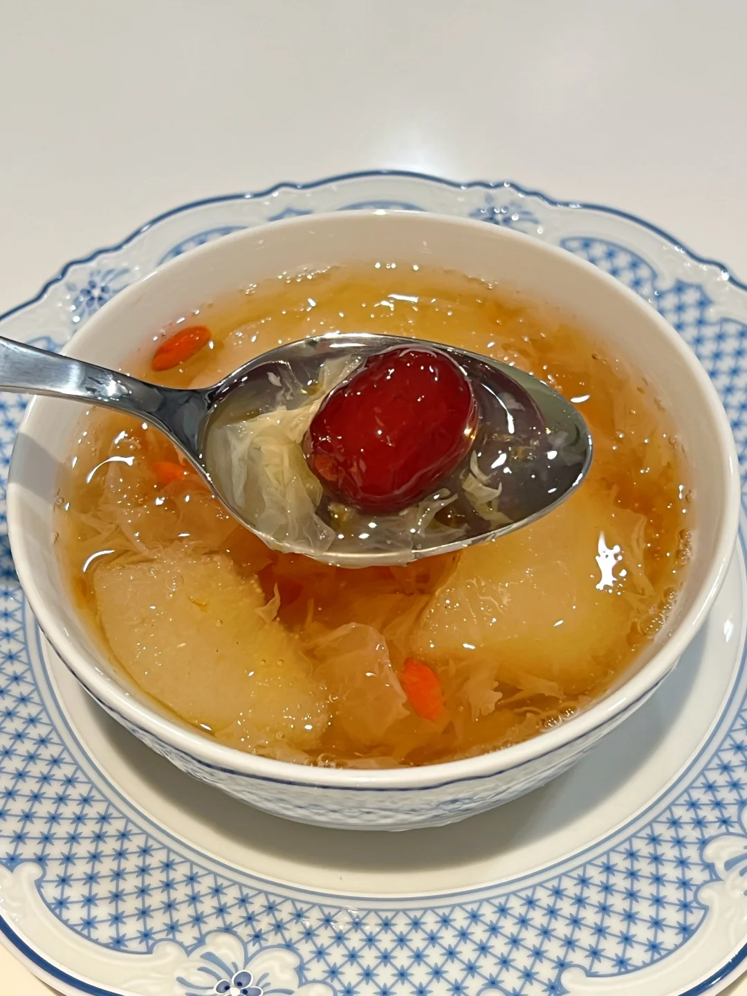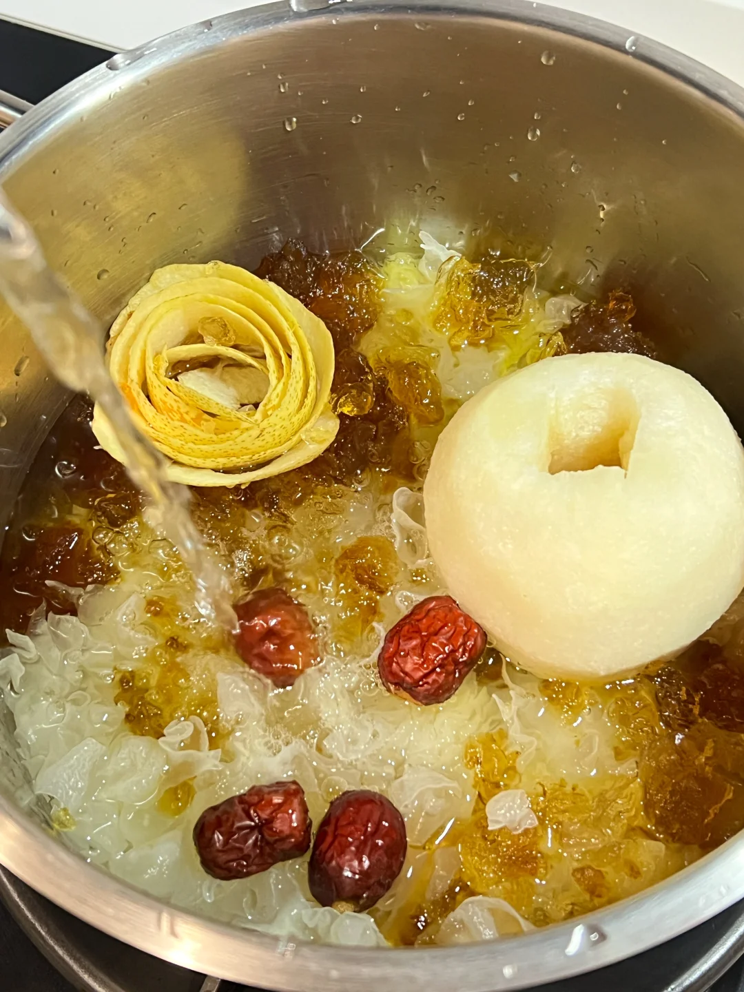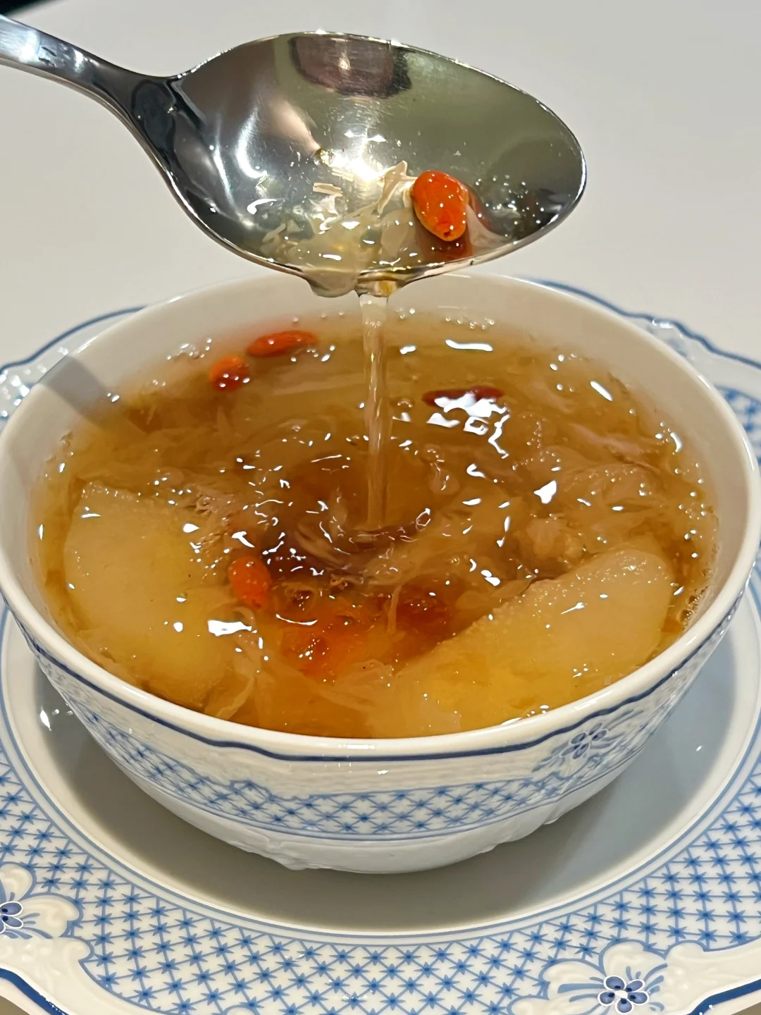 最近大降温,天气干到不行,皮肤和喉咙都感觉紧绷绷的。在家慢火煮了一锅滋阴润燥的银耳桃胶雪梨羹,整个人都被滋润到了!银耳雪梨都是润肺好物,非常适合在干燥的秋冬季节食用~ 🧑‍🍳食材: 1️⃣新鲜银耳半朵 2️⃣雪梨1个 3️⃣桃胶6颗 4️⃣去核后红枣4个 5️⃣枸杞适量 6️⃣冰糖适量 🥣做法: 1️⃣雪梨削皮,用小刀在中心切四刀,去芯。雪梨皮卷起来备用。 2️⃣锅中加入雪梨,梨皮,银耳,桃胶,红枣,加1升清水,大火烧开后小火煮20分钟,捞出梨皮弃之不用。 3️⃣加入冰糖,枸杞煮至融化即可。 ❗️小贴士: 1️⃣红枣核燥热,用之前记得去核。 2️⃣冰糖清润,和银耳搭配更合适。 3️⃣桃胶提前在冰箱泡发12小时。