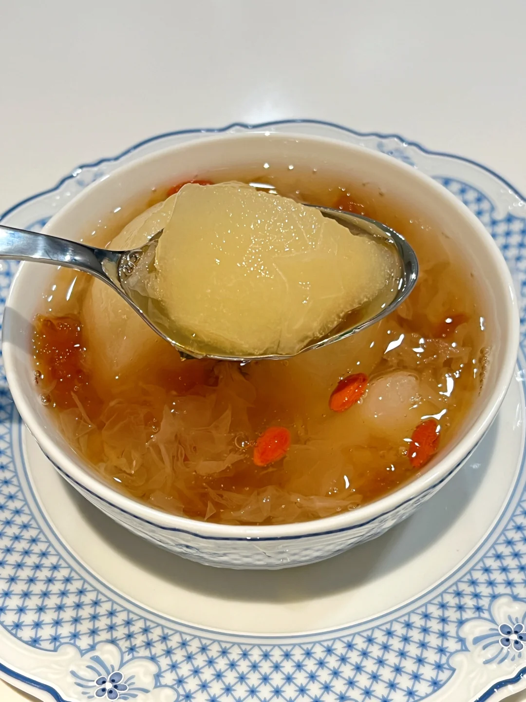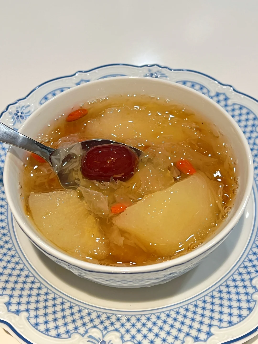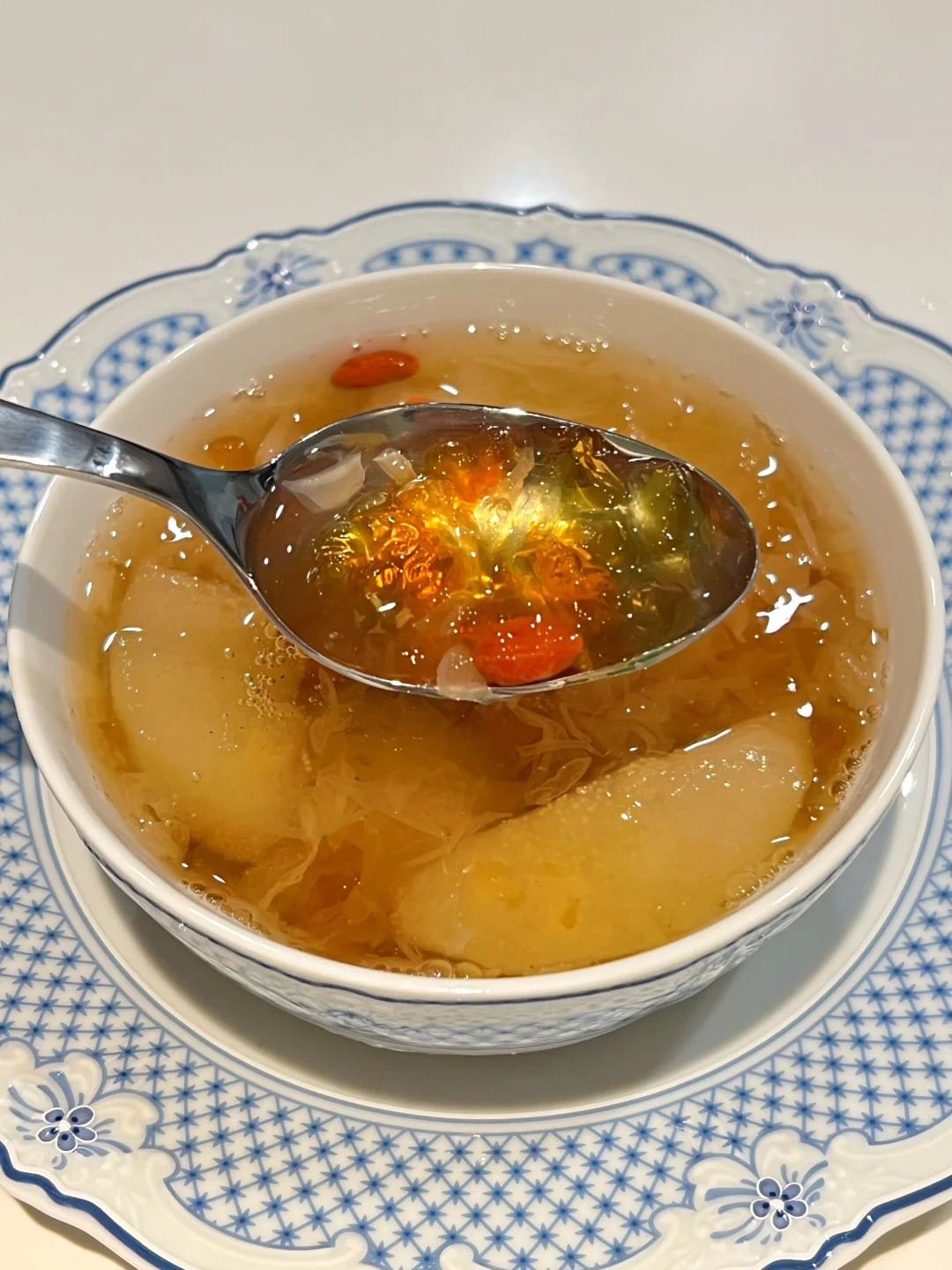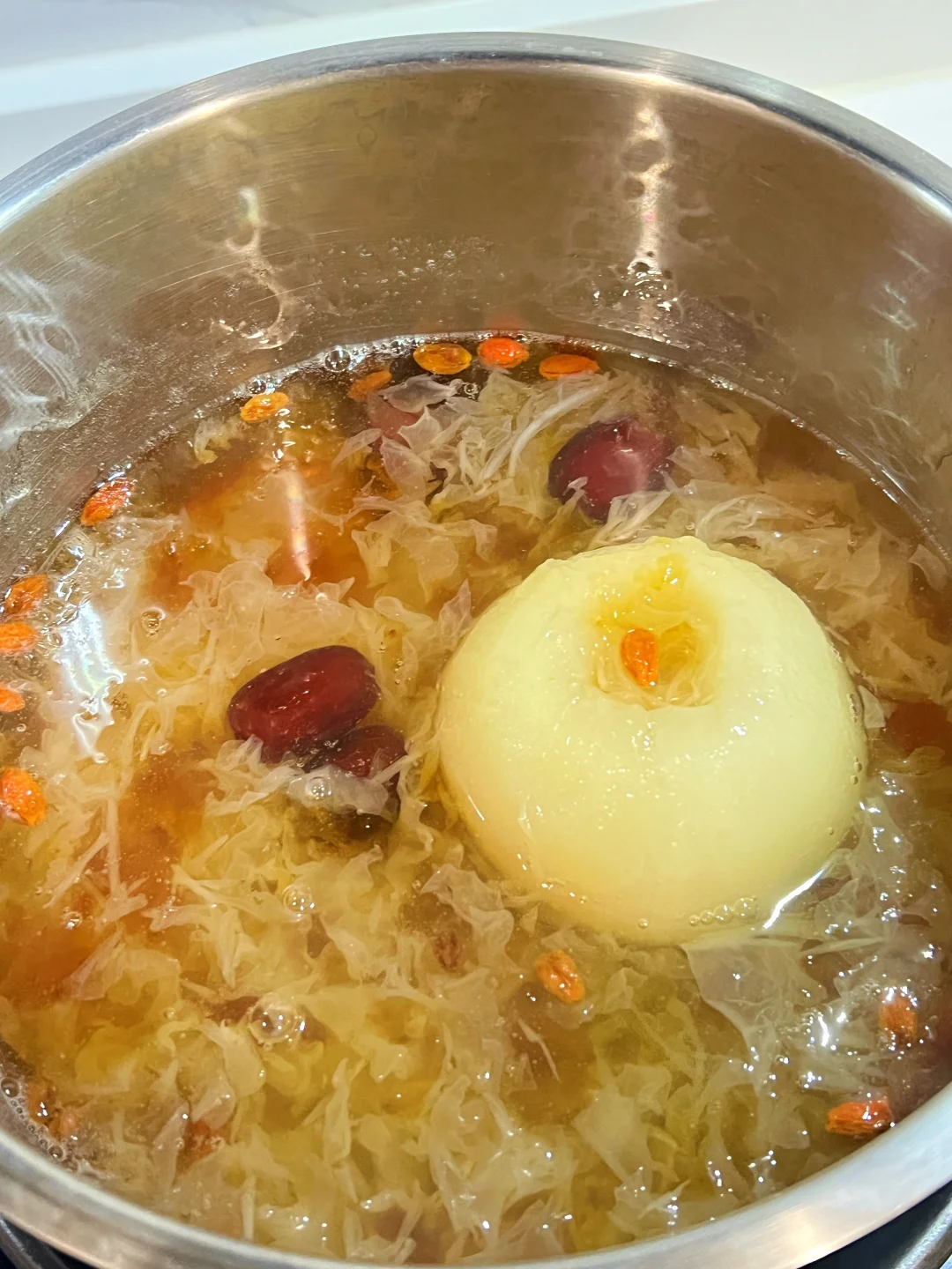 最近大降温,天气干到不行,皮肤和喉咙都感觉紧绷绷的。在家慢火煮了一锅滋阴润燥的银耳桃胶雪梨羹,整个人都被滋润到了!银耳雪梨都是润肺好物,非常适合在干燥的秋冬季节食用~ 🧑‍🍳食材: 1️⃣新鲜银耳半朵 2️⃣雪梨1个 3️⃣桃胶6颗 4️⃣去核后红枣4个 5️⃣枸杞适量 6️⃣冰糖适量 🥣做法: 1️⃣雪梨削皮,用小刀在中心切四刀,去芯。雪梨皮卷起来备用。 2️⃣锅中加入雪梨,梨皮,银耳,桃胶,红枣,加1升清水,大火烧开后小火煮20分钟,捞出梨皮弃之不用。 3️⃣加入冰糖,枸杞煮至融化即可。 ❗️小贴士: 1️⃣红枣核燥热,用之前记得去核。 2️⃣冰糖清润,和银耳搭配更合适。 3️⃣桃胶提前在冰箱泡发12小时。