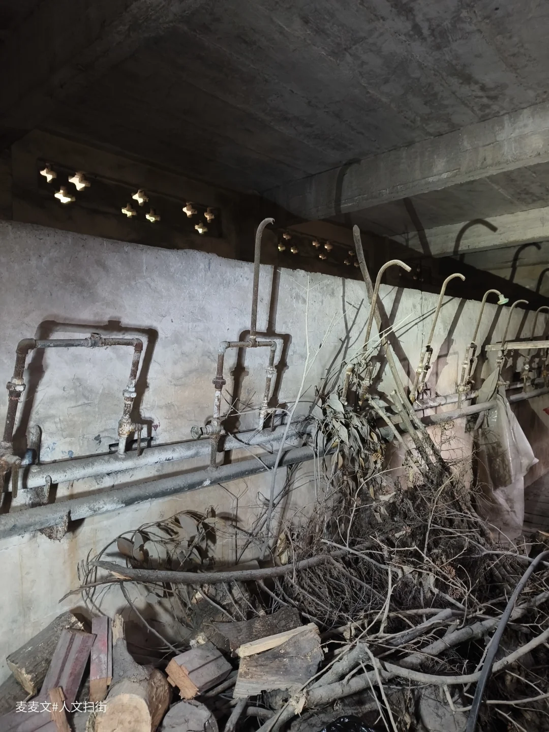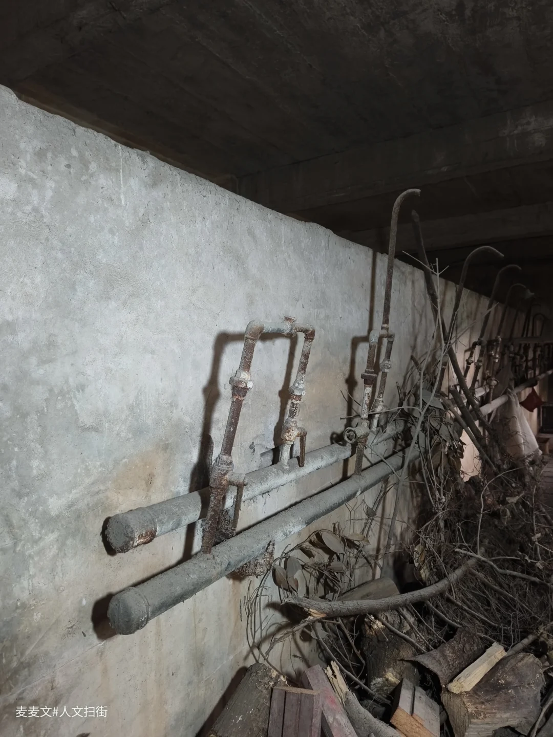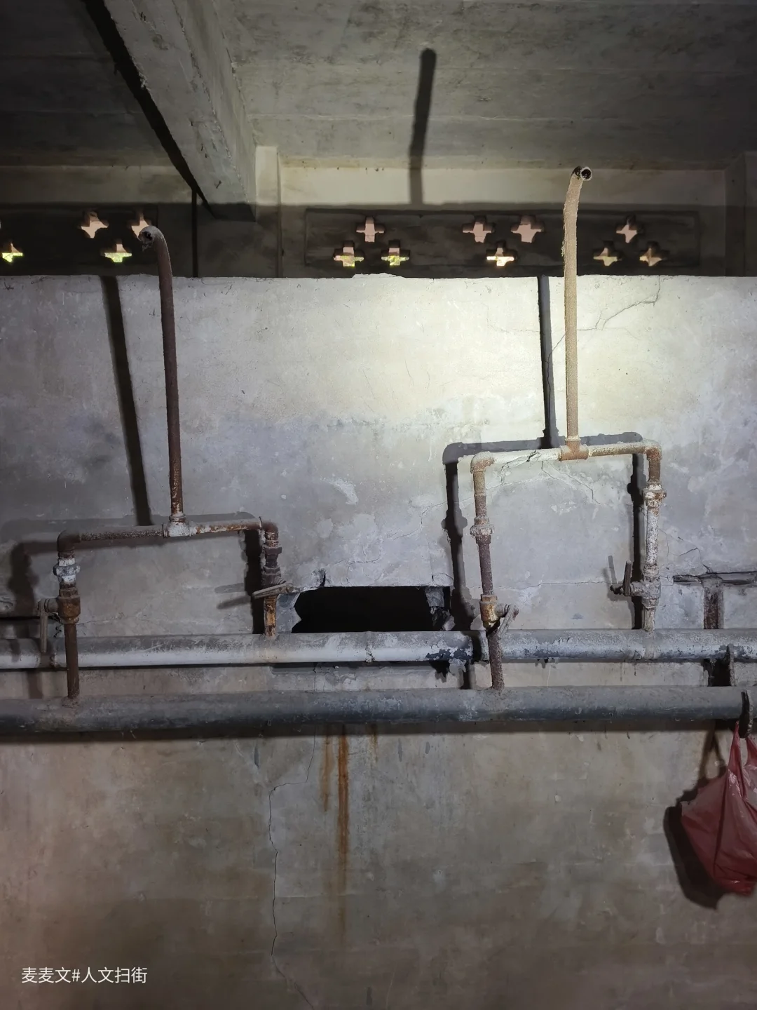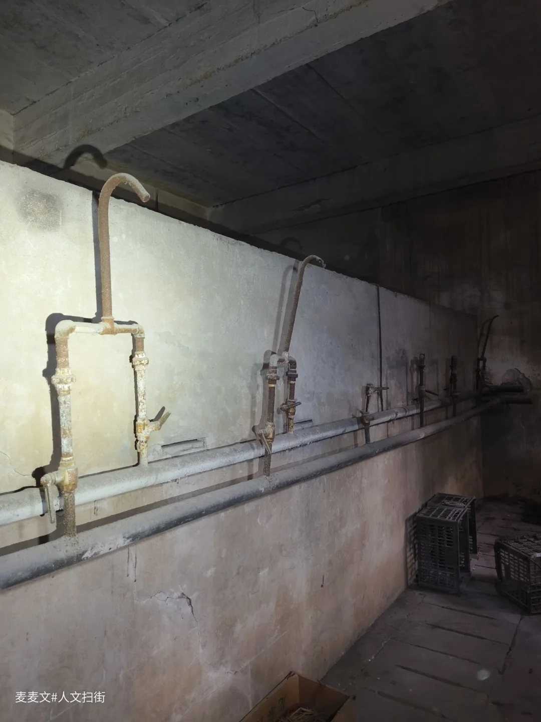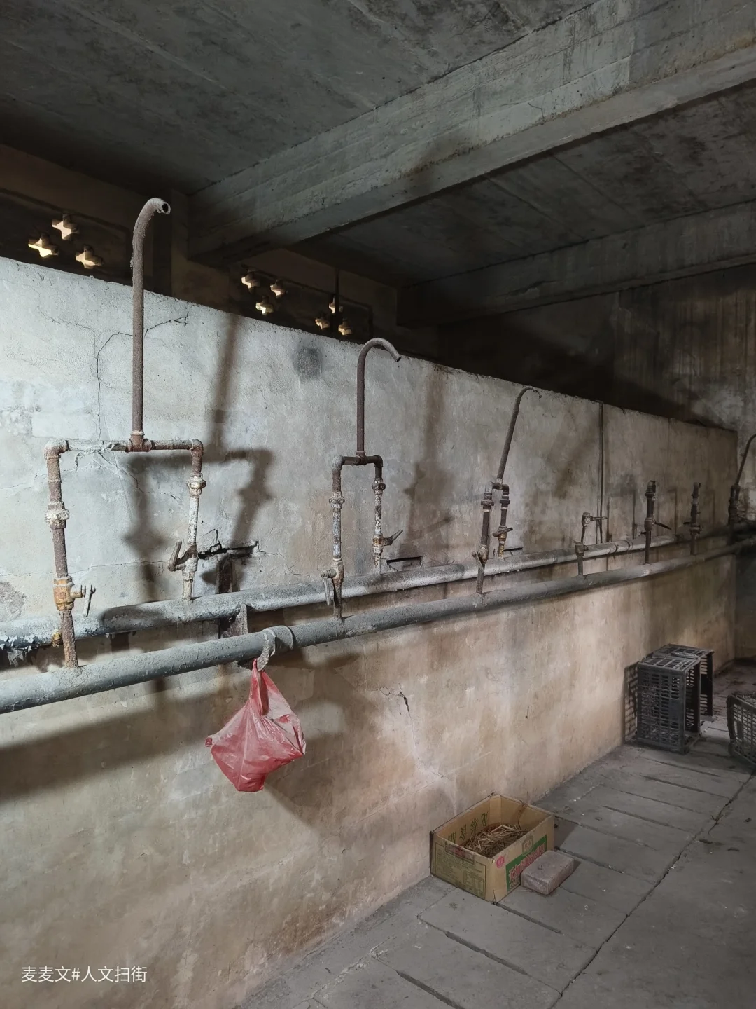 淋浴室昏暗的光线中,靠墙而立的是一排老旧的水管装置。铁管早已锈迹斑斑,弯曲的龙头像是垂暮老人佝偻的脊背,在岁月里沉默着。