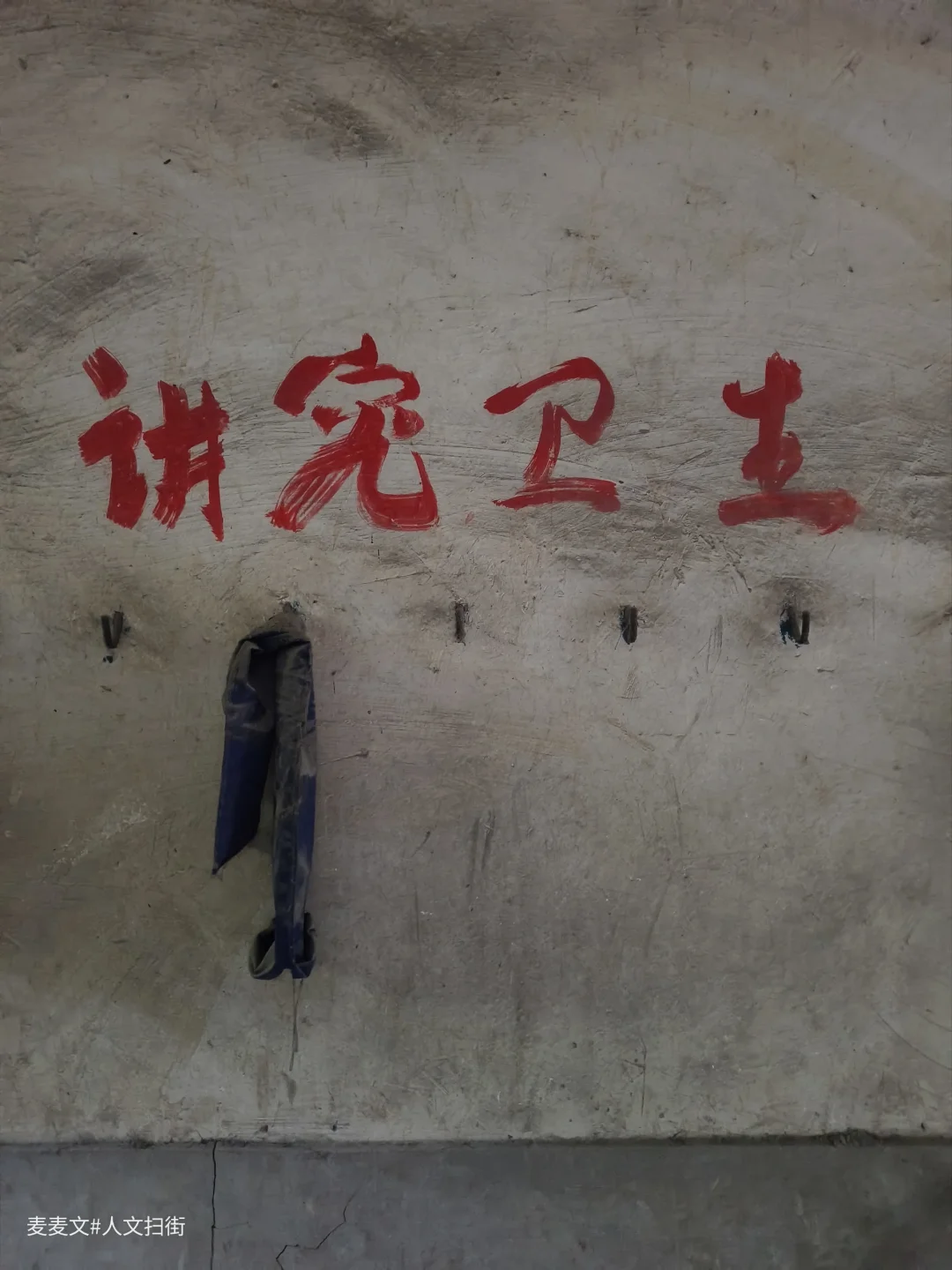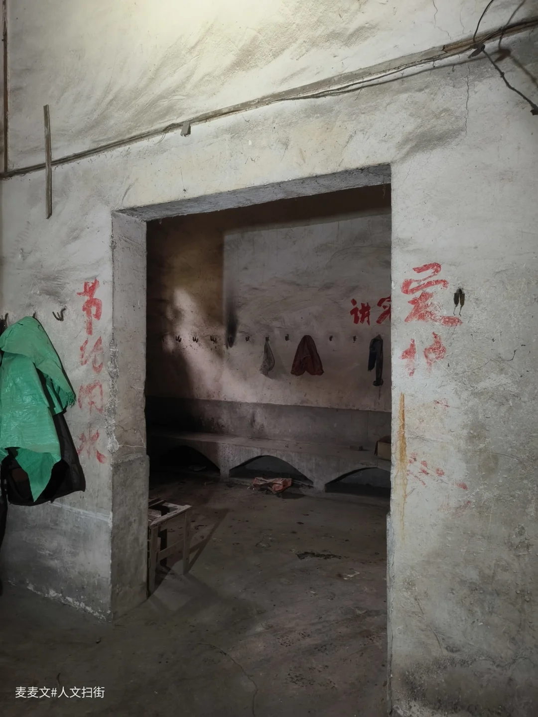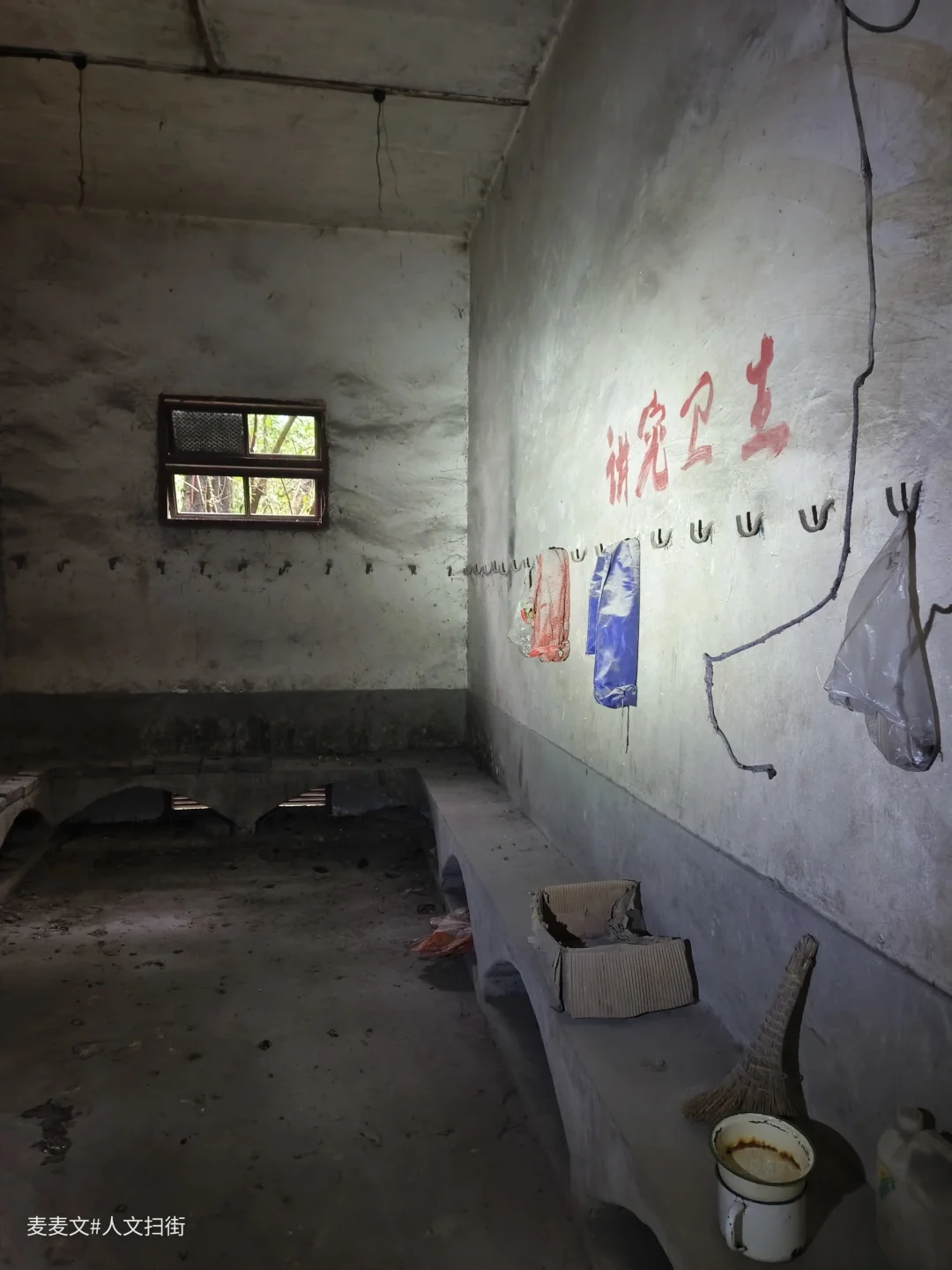 在重庆合川的一处老厂里,偶然邂逅了一座废弃浴室。推开女浴室的木门,一股陈旧的气息扑面而来。更衣室斑驳的墙壁上,“讲究卫生”几个红漆大字依旧醒目,只是岁月已让这字迹略显沧桑。墙上的挂钩孤零零地挂着几个破旧塑料袋,仿佛还在等待着曾经的使用者。