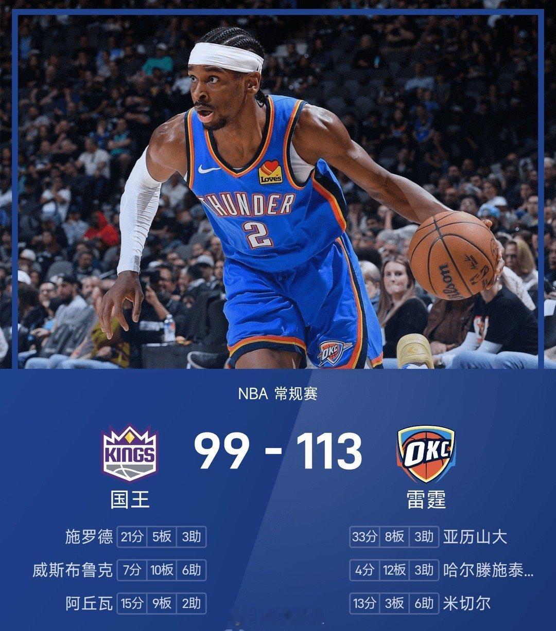 25/26赛季NBA 常规赛,雷霆对阵国王。双方全场战罢,雷霆113-99战胜国王。亚历山大砍下全场最高的33分8板3助,率领雷霆成功取胜。