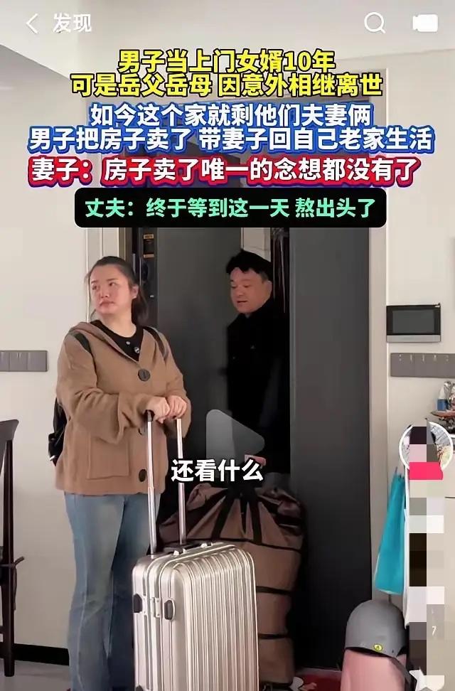 男子当了10年上门女婿,岳父母一去世就卖了房子带老婆回自己老家。临走时老婆舍不得
