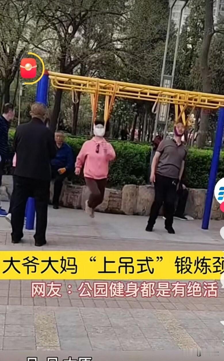 大爷大妈上吊式锻炼身体,真的有效吗? 最近很流行一种锻炼身体的方式,就是用一种布套子把自己吊起来,像上吊一样,据说能锻炼颈椎!不是有的人拿个带子 脖子挂着嘛像上吊一样,据说这样能防止颈椎病,老年痴呆,还有脑梗! 但是我看了觉得不安全,看起来也吓人! 不小心带子断了,周围也没人,那不是活活被挂在那! 感觉还是年轻人锻炼方式靠谱! 还看到有老人用后背撞树!不知道什么原理!
