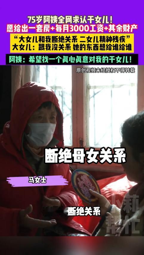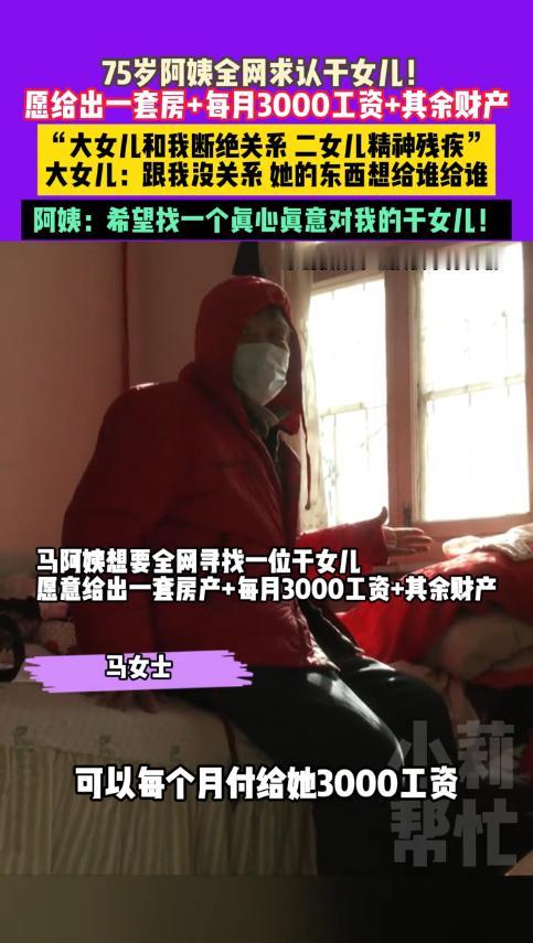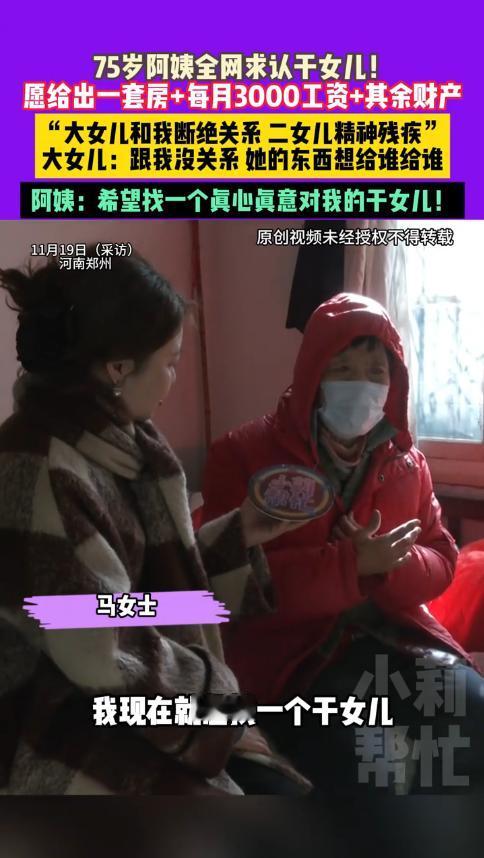 “看哭了!”近日,河南郑州,一75岁老太因大女儿断绝母女关系,二女儿精神残疾,愿意用一套房产来认干女儿,每个月还给开3000元的工资,死后更是能继承自己的财产,唯一的要求就是对自己真心实意!网友:家家有本难念的经! 百善孝为先,孝敬老人是咱们的传统美德,但是现在年轻人的工作压力大,没有时间精力去照顾老人,往往就是把他们送去养老院,殊不知,心里的空缺才是最难弥补的。 据媒体11月19日的报道,马老太今年75岁高龄了,虽然现在身体没什么大毛病,但是内心却非常空虚。 原来,马老太很早就离婚了,她努力将两个女儿抚养长大,可如今二人都对她不管不顾。大女儿由于在外地工作,对于老母亲不管不问的,甚至不愿联系,还要断绝母女关系。 而二女儿呢,因为精神方面有问题,照顾自己都是问题,更别说照顾她了。为了能有个陪伴自己的人,马老太这才开始全网认干女儿,她愿意给对方一套房子,每个月还有工资拿。 虽然马老太开出的条件很优渥,但是网友们却并不心动,毕竟一个家庭不会无缘无故变成这个样子,万一到时候被老人百般刁难,岂不是白白浪费感情了! 更有网友刁钻的指出,这哪里是认干女儿,分明是想花3000元找个保姆伺候自己。大家觉得呢? 信息来源:《11月19日(采访)河南郑州,75岁阿姨全网求认干女儿!愿给出一套房+每月3000工资+其余财产,“大女儿和我断绝关系,二女儿精神残疾”,大女儿:跟我没关系她的东西想给谁给谁。》小莉帮忙