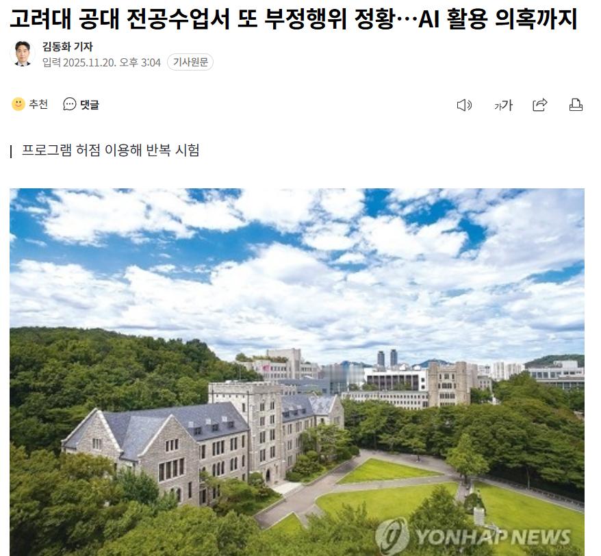 【韩国高丽大学专业课再现作弊嫌疑…甚至涉嫌利用AI】 此前因教养课集体作弊引发争议的高丽大学,如今在工科专业课上再次被发现存在作弊迹象。据大学界消息,高丽大学工科学院的一门专业课于20日上午10点30分左右,对约80名听课学生(在教室)进行了在线测验评估。然而,据透露,部分学生利用了程序结构上的漏洞——即答题后可立即确认结果并重新参加测验,于是在确认答错的题目后,反复多次参加了考试。此外,还有情况表明,部分学生涉嫌使用ChatGPT或Gemini等生成式AI来撰写答案。接到学生举报的授课教授表示"发现了多数学生重复参加测验的迹象",并发布通知称将本次测验全部作废,并实施重考。高丽大学目前正在确认具体的事实关系。学校相关人士表示:"正处于了解整个事件原委的阶段,关于是否对学生进行处分尚需讨论。"
