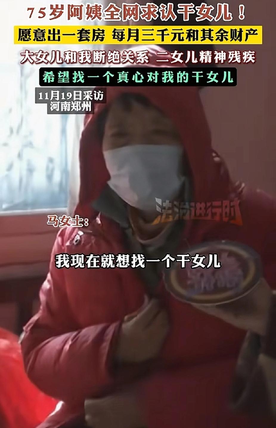 河南,全网认干女儿的马阿姨,确实走投无路了!75岁,有哮喘,独居在郑州的老房子,扒了下,大女儿和她闹掰,是前几年,失业的大女儿想让身体还硬朗的马阿姨搭把手,马阿姨却觉得自己苦了一辈子,该享享福了,不仅没帮忙,还跟女儿吵了好几次,甚至说:我的钱以后想给谁就给谁! 如今大女儿没固定工作,独自带娃,压力大,她说连自己都顾不上,怎么顾得上马阿姨? 之后,女儿就再也没联系过母亲。 大女儿跟她断绝关系,二女儿精神残疾无法自理,所以她只能全网求助,愿意拿出一套房、40万存款再加每月3000元,只求找个真心待她的干女儿,能给她递口热饭、遇事帮她拿个主意! 看得让人有些不是滋味。 马阿姨早年就跟丈夫离了婚,一个人把两个女儿拉扯大,那时候她在工厂上班,白天搬零件、晚上缝衣服,总想着等孩子大了就好了,结果却弄到今天这境地。 马阿姨有严重的哮喘,晚上常常咳得睡不着,最怕哪天夜里喘不上气,连个叫救护车的人都没有,她不是没考虑过请保姆,手里的存款足够付工资,但之前邻居家的老人请了保姆,结果老人突发心梗时,保姆慌得忘了打120,最后还是邻居发现才送了医。这件事让她觉得保姆只认钱,不认人,思来想去,才决定找个干女儿,能把她当亲人,在她走后能多照看点二女儿。 然而,联系她的人里,大多一上来,不是问房子在哪?就是问存款能不能先取?这让她更着急。 原本该安享晚年的老人,因为家庭矛盾和身体问题,只能用财产来换照顾,实在让人唏嘘!希望能有个靠谱的人,能看到马阿姨的无助,不是冲着她的财产,而是真的愿意陪她走过最后的日子,也帮她多照看点那个同样可怜的二女儿。