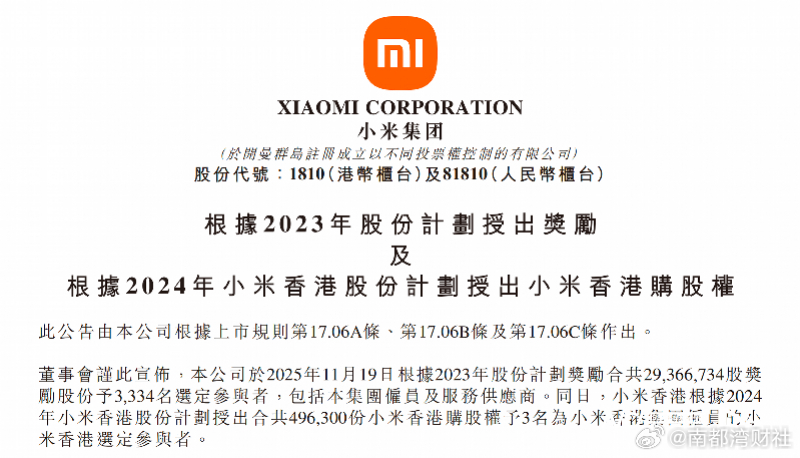 【11.4亿港元!】11月19日晚,小米集团(01810.HK)发布公告,称公司根据2023年股份计划奖励合共29366734股奖励股份予3334名选定参与者,包括集团雇员及服务供应商。以小米集团11月19日收盘股价每股38.82港元测算,本次授予股份的总价值约11.4亿港元。公告还提到,小米香港还根据2024年小米香港股份计划授出合共496300份小米香港购股权予3名为小米香港集团雇员的小米香港选定参与者。截至本公告日期,根据小米香港计划授权限额及小米香港服务供应商分项限额,分别有527087611股及50000000股小米香港股份可供未来授出。公开资料显示,早在2022年3月,小米集团宣布上市以来针对员工的最大一次激励计划。该激励计划显示,小米集团将向4931位员工授予约1.749亿股小米股票,其中包括小米“创业者计划”第二期入选员工以及其他优秀员工。公告显示,授出奖励日的股份收市价为14.78港元,按此计算,此次小米奖励股份总额价值为25.85亿港元,约合每人52.42万港元。 11月18日,小米集团刚发布了2025年第三季度财报。财报显示,小米三季度总营收1131亿元,同比增长22.3%,环比下跌2.4%;经调整净利润113亿元,同比增长80.9%,环比增长4.4%。值得注意的是,第三季度小米智能电动汽车及AI等创新业务分部实现经营收益7亿元人民币,这是该业务首次录得盈利。三季度,小米共交付108796辆新车,创历史新高,大规模生产使得单车的制造成本分摊降低。从产品结构上看,Xiaomi SU7 Ultra从2025年3月开始交付,高附加值产品交付占比的提升拉高了整体收入及利润水平,汽车ASP(平均销售价格)从25.37万元提升至26.01万元。11月19日,小米公关部总经理王化发布日程表,称2025小米人车家全生态合作伙伴大会将于12月17日举办。日程表显示,小米集团合伙人、集团总裁卢伟冰等人将在主论坛发言。此外,刚刚加入小米的罗福莉将以MiMo大模型负责人身份进行首秀。(南都N视频记者 林文琪)