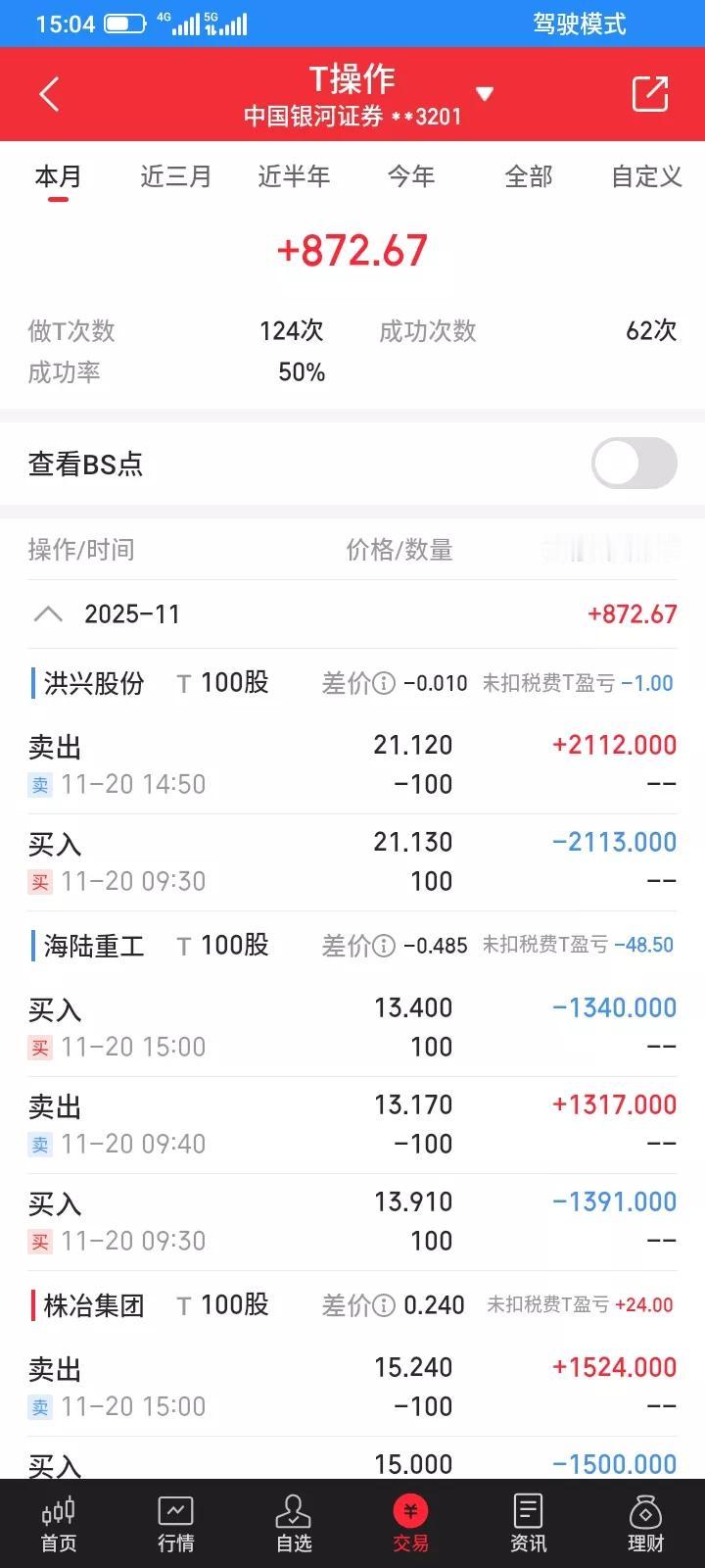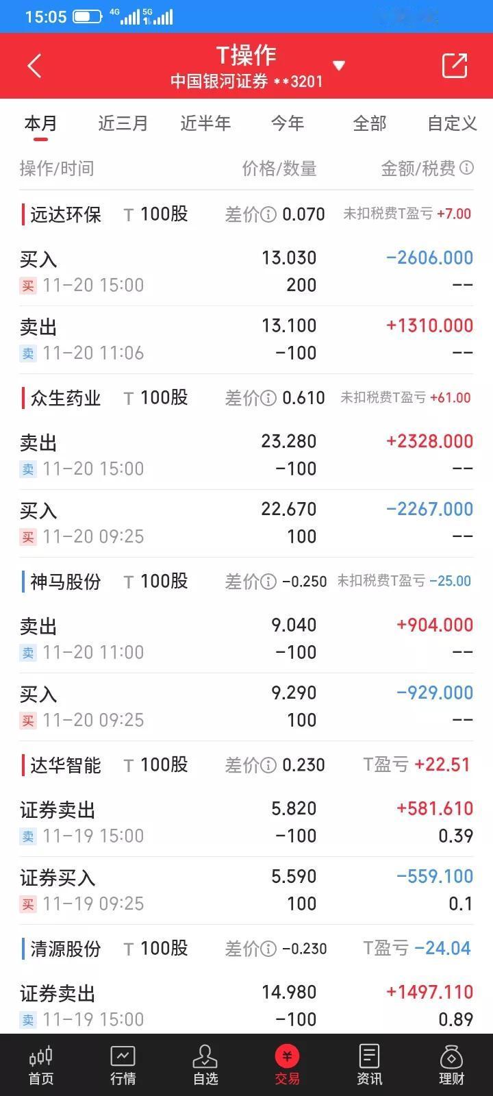 2025.11.20,今天t了100股海陆,t了100股株冶,t了100股远达,t了100股洪兴,t了100股众生,t了100股神马,做得不好,盈亏相抵,才赚2元,印花税都不够。