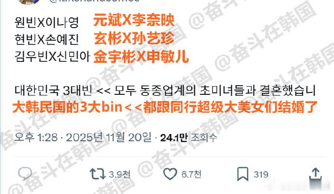 韩网热议元斌、玄彬、金宇彬的共同点:都跟同行大美女结婚了!