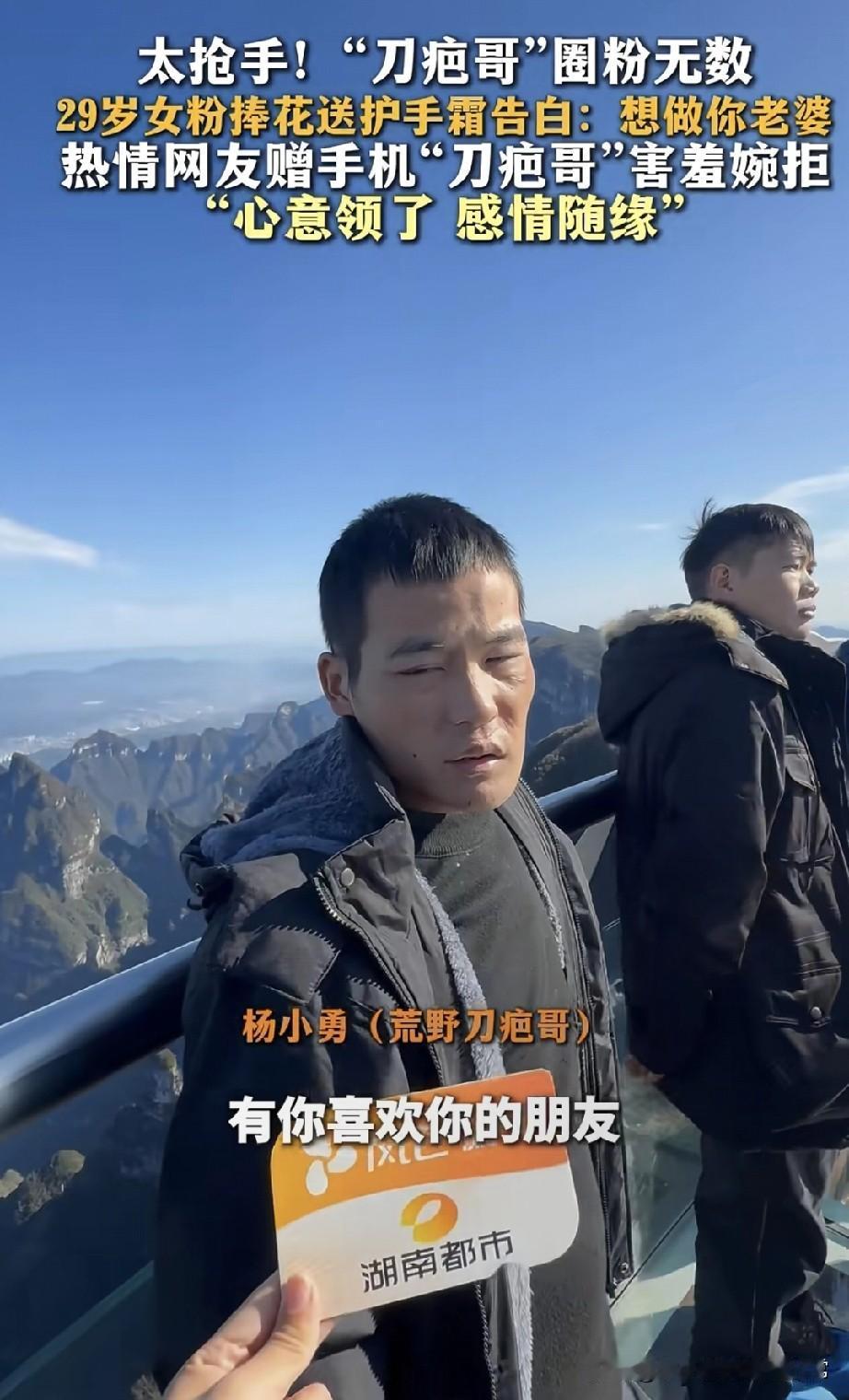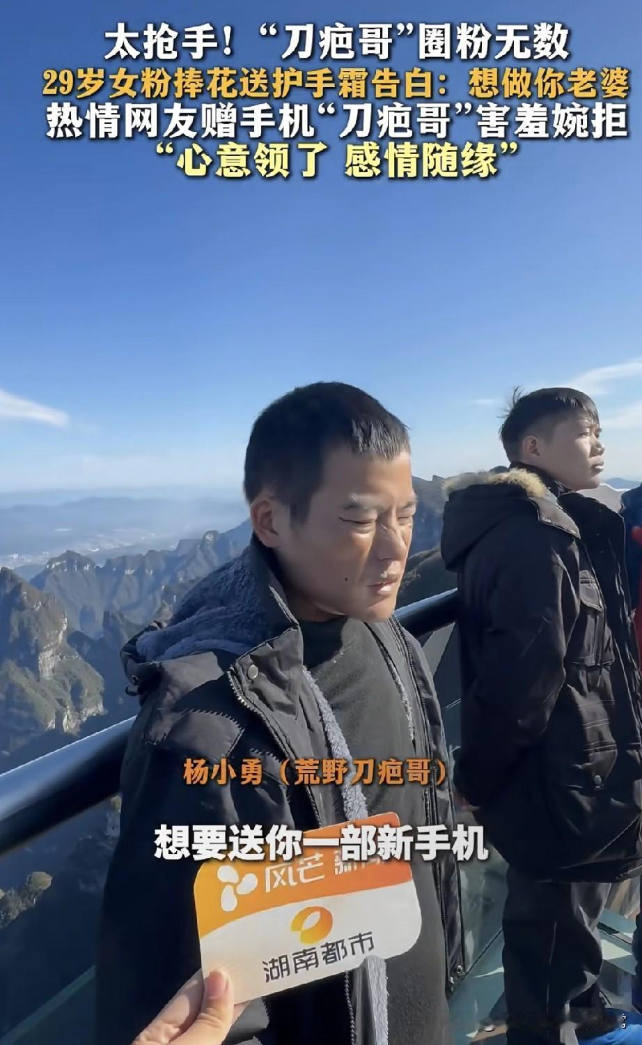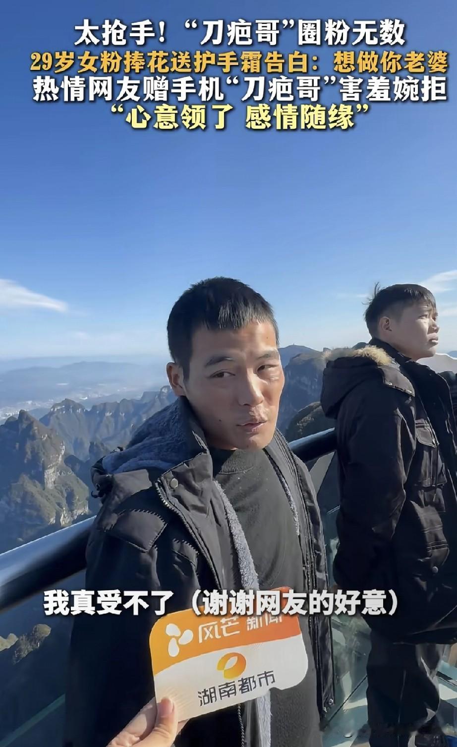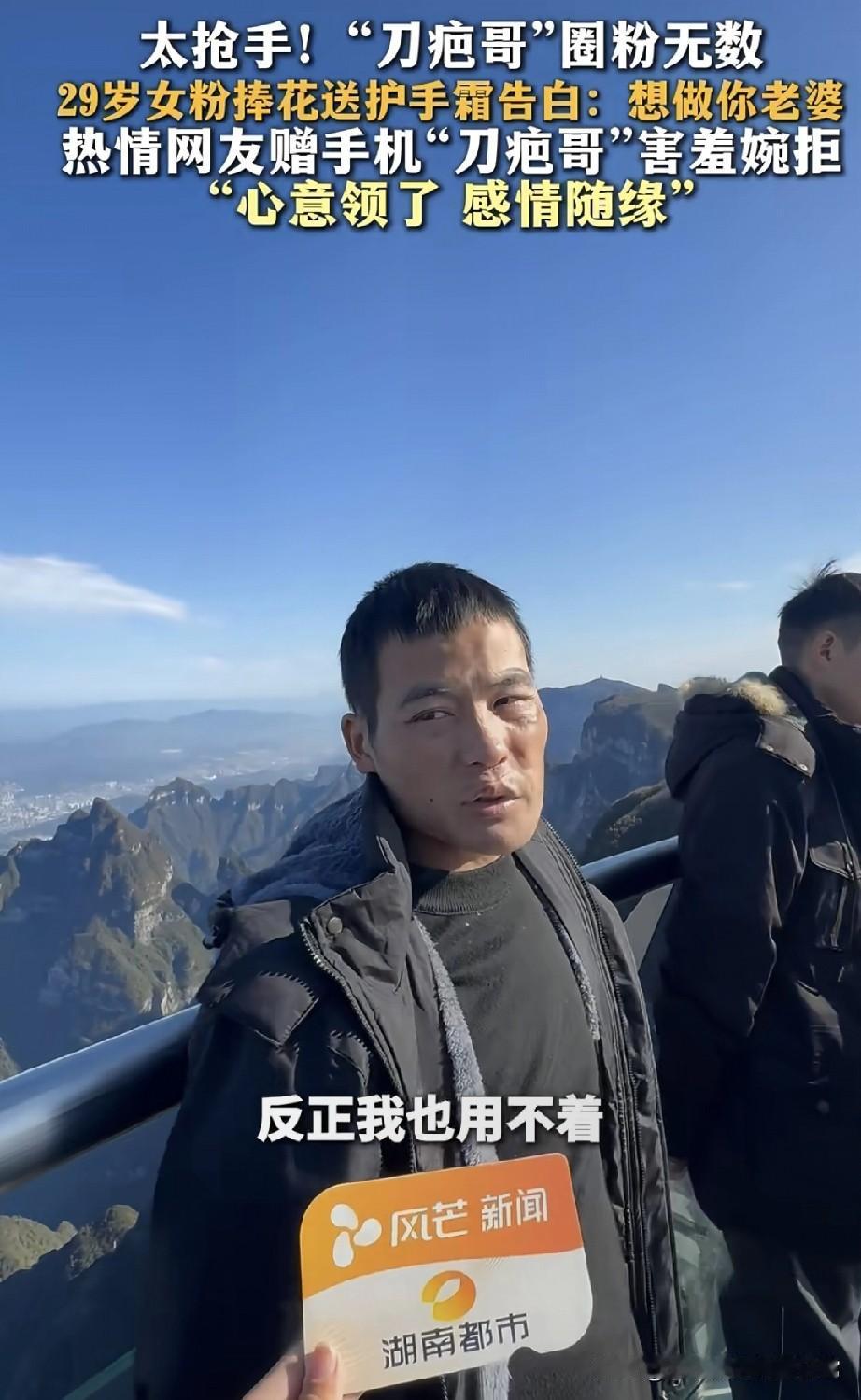 荒野“刀疤哥”凭啥这么火! 张家界七星山的“刀疤哥”彻底出圈了——热情网友直接要送新手机,他却红着脸摆手:“心意领了,感情随缘,手机我也用不着”。 镜头里他站在观景台还犯恐高,搓着手说“有点晕”,糙汉的害羞劲儿戳中一堆网友:“这才是真实的活人,比包装出来的网红顺眼多了”。