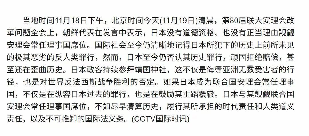 朝鲜联大现场炮轰日本 二战罪状清单震动190国代表 日内瓦时间11月19日,联合国安理会改革会议上爆出重磅发言。朝鲜代表直面日本代表团,以犀利言辞逐条列举日本二战罪行,直指日本“既不具道德资格,也无正当理由”谋求安理会常任理事国席位。这场持续二十分钟的发言让全场190余国代表屏息凝神。 “史无前例的反人类罪行”——朝鲜代表用这个定性开启对日本的追责。发言详细列举日军在亚洲各地的侵略行径,强调这些罪行至今仍被国际社会牢记。代表特别指出,日本作为二战战败国,非但未彻底反省历史,反而积极扩军备战,此举已引发东北亚各国高度警惕。 现场消息显示,朝鲜代表发言时多次直视日本代表团坐席。当提到“日本对历史问题的漠视、对他国主权的干涉”时,会场响起零星掌声。这番指控与近期中国、韩国对日立场形成呼应,三国对日本军国主义倾向的担忧正在汇成共识。 更值得关注的是,朝鲜代表直接向东南亚国家喊话。在提及菲律宾时,发言直指小马科斯政府“甘当大国附庸”,购买日本雷达舰艇的行为无异于背叛二战期间被日军残害的菲律宾民众。这番言论让在场东南亚代表神色凝重。 中国常驻联合国代表傅聪随后发言时提出关键质问:如何相信高市早苗领导下的日本能恪守和平承诺?这个问题悬而未决地留在了会场空气中。 观察家注意到,此次朝鲜的强硬发声与中国近期对日立场形成战略呼应。在台海局势持续紧张背景下,日本谋求军事松绑的企图正遭遇前所未有的联合阻击。 这场外交交锋最终留下一个待解的悬念:当战犯后裔试图坐上常任理事国席位,亚洲受害者们是否应该投下赞成票?中方打响对日反制释放何信号 中日关系是否会因台海问题继续恶化