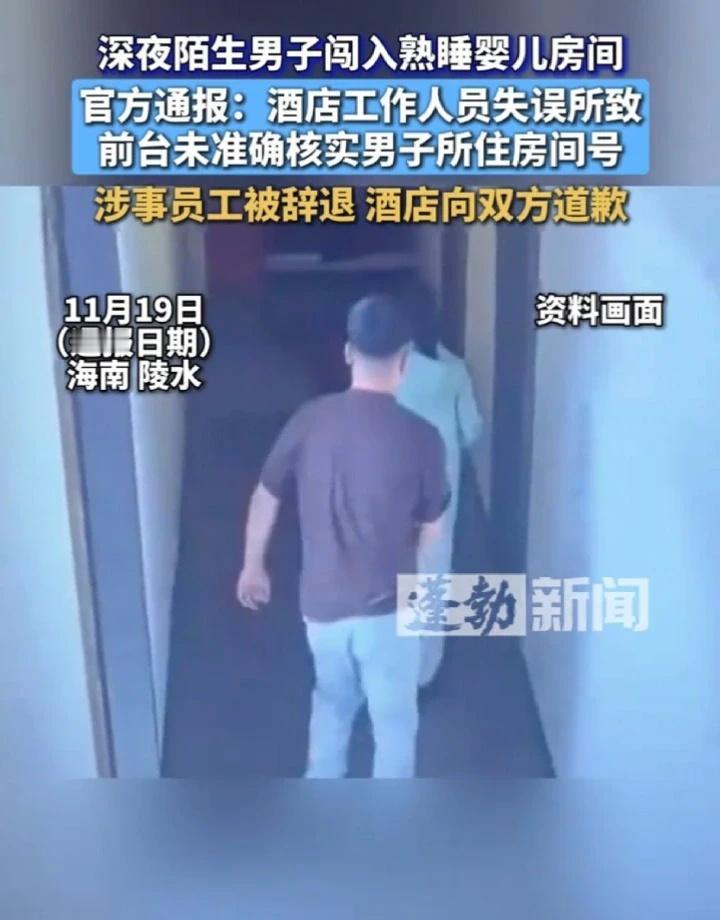 深夜陌生男子闯入熟睡婴儿房间 官方通报 深夜陌生男子闯入熟睡婴儿房间,官方通报:酒店工作人员失误所致,前台未准确核实男子所住房间号,涉事员工被辞退 酒店向双方道歉。(蓬勃新闻)热点 热点新闻事件 社会新闻 真实案件