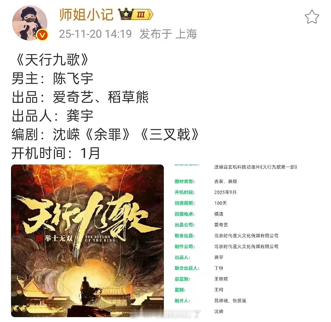 陈飞宇不去《告白》去《天行九歌》了,编剧是《余罪》和《三叉戟》的编剧,看起来班底不错,很靠谱。
