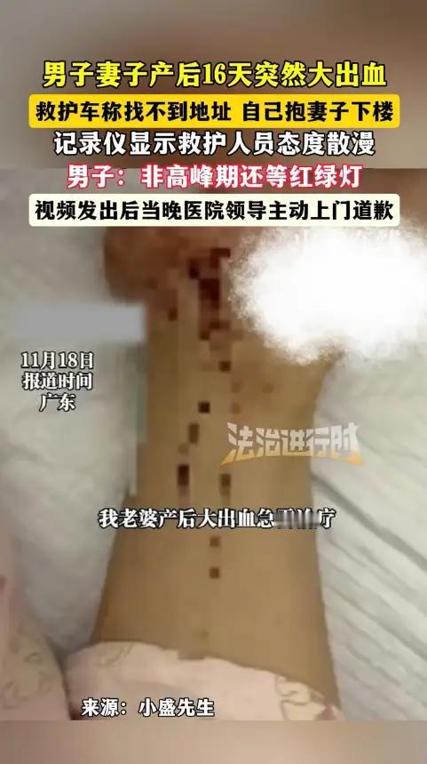 生命通道容不得半点敷衍!深圳产妇大出血遇冷漠急救,全网怒喊严查 “老婆快撑不住了!”11月18日傍晚,深圳盛先生的呼救声划破小区宁静。刚产后16天的妻子突发大出血,鸡蛋大的凝血块不断排出,脸色惨白如纸,意识逐渐模糊——这是孕产妇死亡的首要元凶,每一分钟都在吞噬生命。 焦急万分的盛先生立刻拨打120,清晰报出地址,可救援电话那头却反复传来“找不到地方”的回应。眼看妻子气息愈发微弱,他咬牙将近130斤的妻子裹紧毛毯,从5楼一步步抱下,踉跄着冲向小区门口,全程不敢停歇。 然而,盼来的救护车却给了他致命一击:医护人员慢悠悠踱步下车,一人紧盯手机屏幕,另一人双手插兜,面对病危产妇竟无动于衷,既未主动接应,也没提前准备担架。盛先生独自将妻子往车上挪时,救护车后门仅开半扇,全程听不到一句病情询问,更无任何急救措施。更离谱的是,非高峰期的救护车未开警灯鸣笛,竟遵守红绿灯行驶,面对“快点救我老婆”的哀求,司机只淡淡说“安全第一”。 万幸的是,医院急诊早已待命,产妇最终脱离危险,医生坦言“再晚几分钟就可能器官衰竭”。现场视频曝光后,24小时播放量破500万,网友怒不可遏:“急救服务是责任不是摆设,这是拿生命当儿戏!” 当晚涉事医院领导登门致歉,涉事人员被停职,深圳卫健委介入调查并启动全市急救排查。但公众的愤怒并未平息:定位系统为何失灵?紧急通行权为何不用?急救人员的职业敬畏心去哪了?生命通道容不得丝毫敷衍,这场整改不仅要严惩失职者,更要堵住制度漏洞,让每一次急救都能真正与死神赛跑。产妇医院身亡 浙江女孩大出血 崩溃产妇