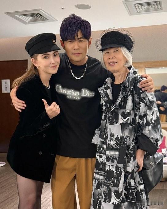 周杰伦(Jay Chou)与他的母亲叶惠美(Yeh Hui Mei)以及妻子昆凌(Hannah Quinlivan)的家庭温馨时刻。