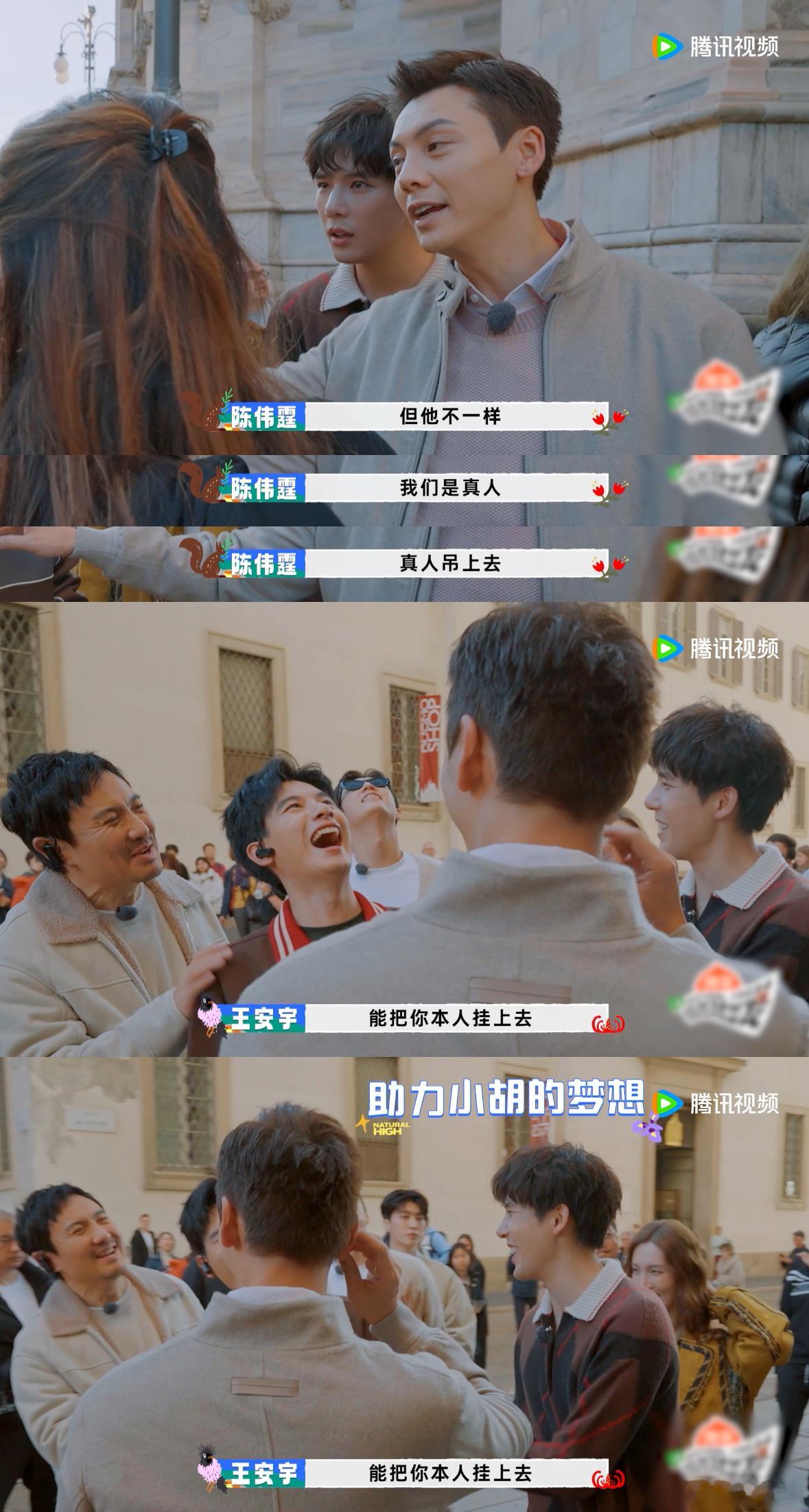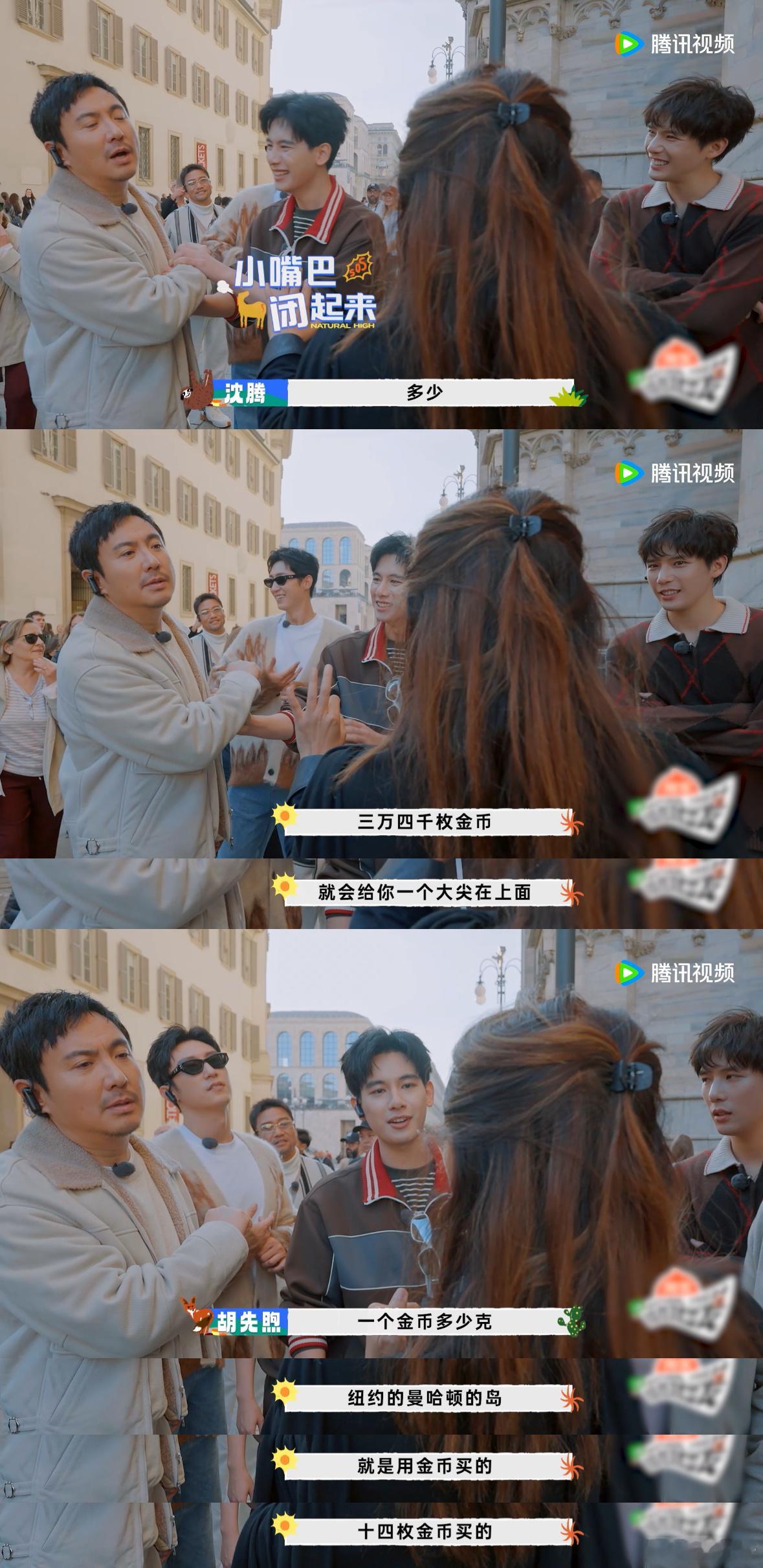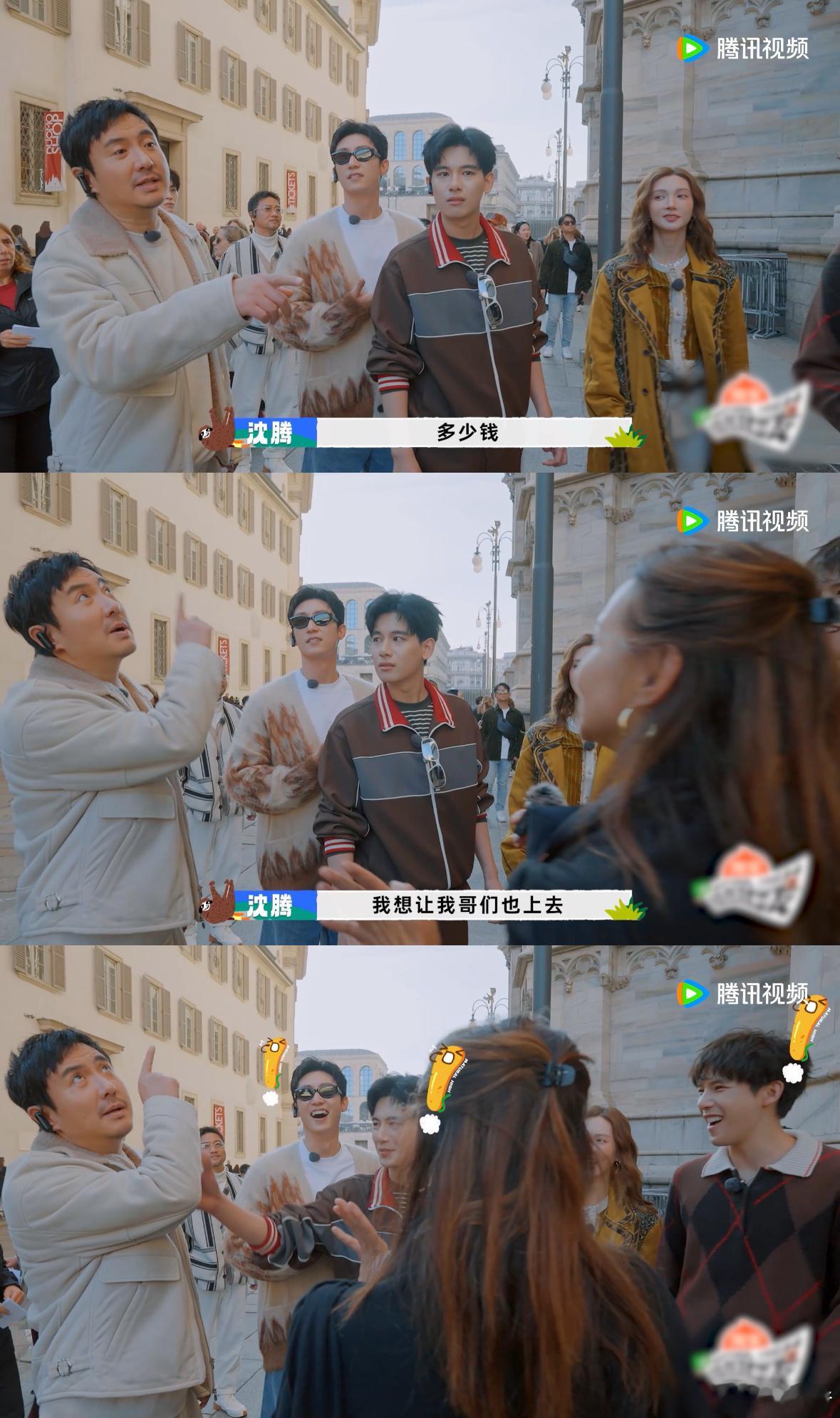 腾哥和胡先煦在米兰大教堂游玩,看到雕塑就开始讨论花多少钱能上去,腾哥的幽默感完全不输,指着胡先煦说:“多少钱想让我哥们也上去!”