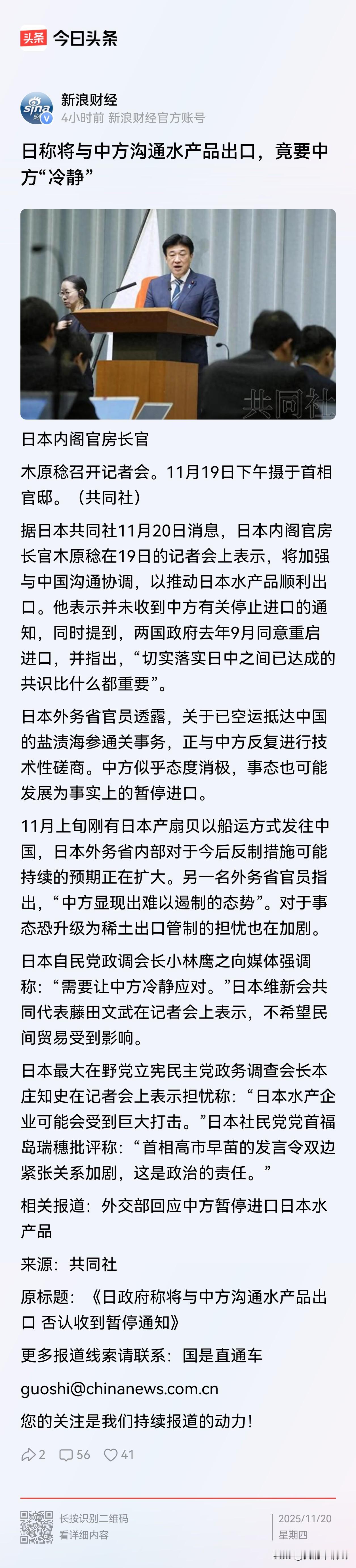 日本竟要中国“冷静”?简直荒唐! 一边纵容政客大放厥词伤害中国人民感情,一边又觍着脸要求中方开放水产品市场?“将加强与中国沟通协调,以推动日本水产品顺利出口”。天底下哪有这样的道理! 高市早苗之流的反华言论余音未了,日方就急不可耐地要来谈生意。既要吃饭又要砸锅,这套强盗逻辑我们绝不接受! 中方态度明确:想谈合作,先端正态度!在涉及中国核心利益的问题上玩火,就别指望经贸往来一帆风顺。日方若执意一条道走到黑,等待他们的必将是更坚决的反制。 中国人有骨气更有底气!不辨是非的“冷静”,我们做不到!