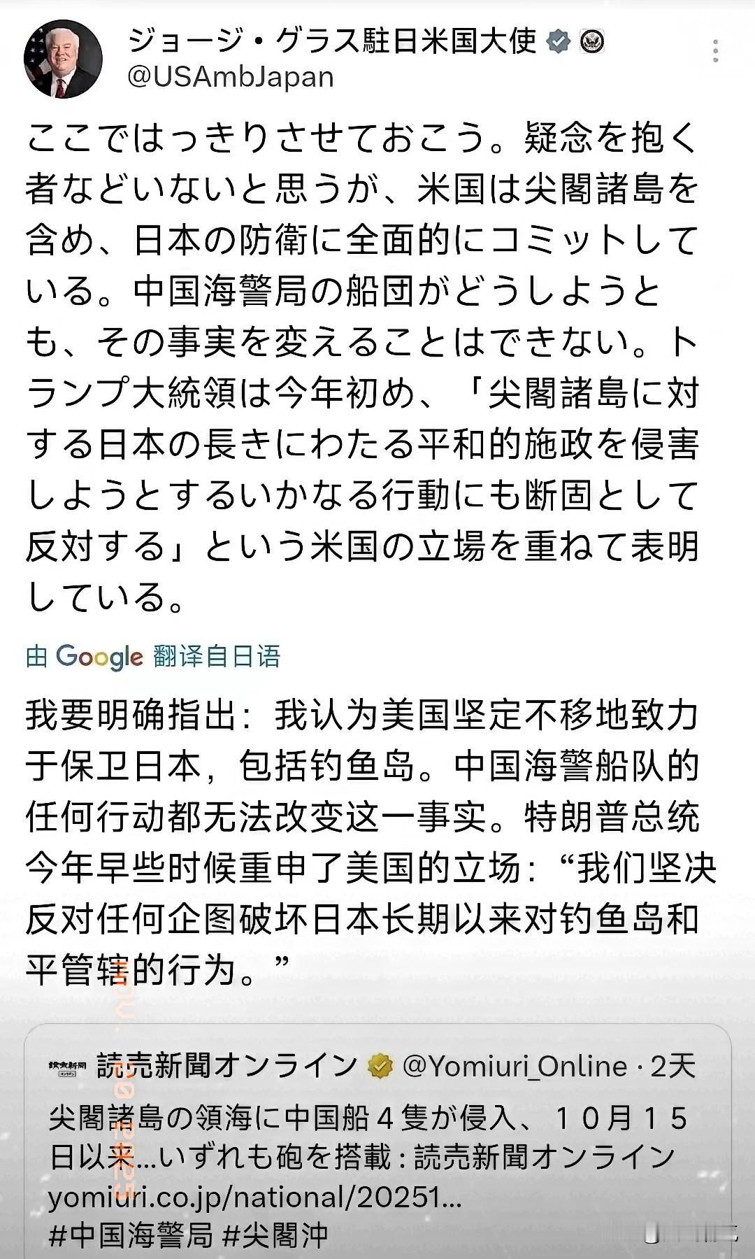 美国又来拱火了! 美国驻日本大使乔治·格拉斯近日贴文公然叫板,声称“美国坚定不移地致力于保护日本,包括钓鱼岛,中方海警队的任何行为都无法改变这一事实”,还搬出特朗普总统的表态,宣称反对“破坏日本对钓鱼岛和平管辖”的行为。 明眼人都看得出来,这哪里是维护和平,分明是给持续挑衅的日本政客递刀,这样火上浇油,就不怕东海局势擦枪走火吗? 美国的拱火从来不是孤立动作,2025年10月特朗普访日期间,美日首脑会谈已明确将钓鱼岛纳入《美日安保条约》第五条适用范围,这已经是美方短期内多次重复类似立场。 而就在格拉斯发声前,五角大楼还曾表态“钓鱼岛处在日本行政管辖之下”,一边说对主权归属不持立场,一边却不断给日本站台,这种自相矛盾的操作,本质就是搅动地区局势。 高市早苗政府更是借美国的“尚方宝剑”得寸进尺,不仅计划提前两年将国防支出提升至GDP的2%,还在修订安保文件突破“专守防卫”原则,甚至叫嚣“武力介入台海”。 美方则通过强化同盟,换来了日本5500亿美元的对美投资,以及在半导体、能源等领域的利益让步,说白了就是用地区安全做交易,拿盟友当棋子。 面对挑衅,中方的回应既坚定又克制。2025年以来,中方海警依法在钓鱼岛领海巡航已超20次,这是维护领土主权的正当行为,有充分的历史和法理依据。 国防部发言人早已明确表态,无论美日说什么、做什么,都无法动摇中方维护主权的决心。 就在日方抗议巡航后,黄海南部实弹射击随即启动,8天的常态化训练,就是对挑衅者最直接的警示。 更值得警惕的是,美日这种捆绑正在催生危险后果。 日本国内已有有识之士警告,军国主义正走向复活前夜,而冲绳民众更是强烈反对美军将当地变成“战场前沿”。 美国一边在俄乌、中东战场分身乏术,一边还要在东海煽风点火,这种战略透支下的拱火行为,一旦引发意外冲突,恐怕不是其能掌控的。 说到底,美国的算盘很精,就是想通过激化东海矛盾,牵制中方发展,巩固其印太战略。 但和平不是喊出来的,而是靠尊重主权换来的。 美方若继续纵容日本挑衅,无视中方核心利益,最终只会搬起石头砸自己的脚,让本就紧张的地区局势雪上加霜。东海不是美国的“后花园”,任何企图破坏和平稳定的行为,都必将遭到坚决反制。美国驻华大使 美驻华大使 首任驻美大使 美国大使伯斯 美国驻丹麦大使 美国驻法国大使 美驻联代表