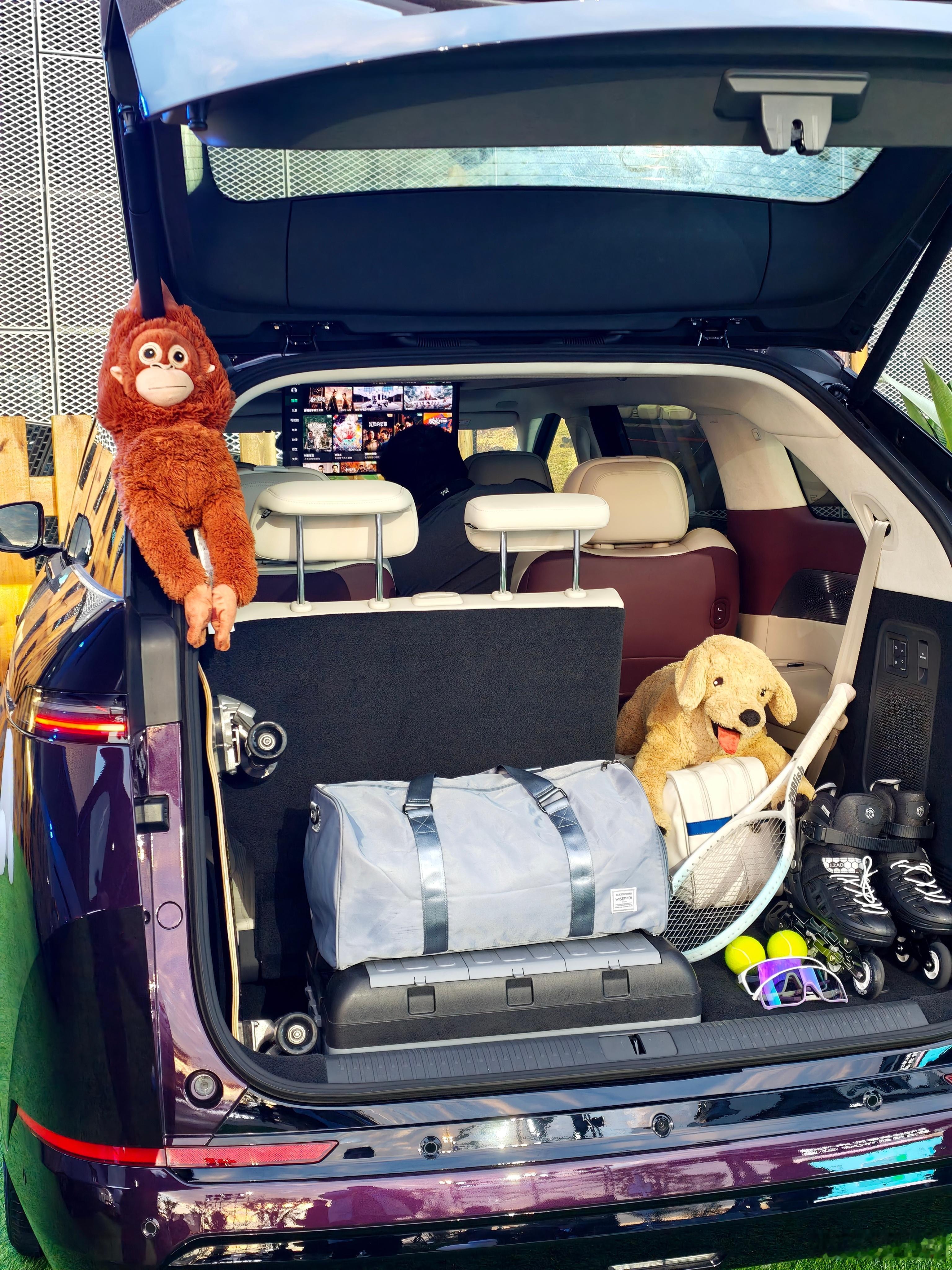 小鹏X9增程版发布会现场的展车后备箱里有猴也有狗