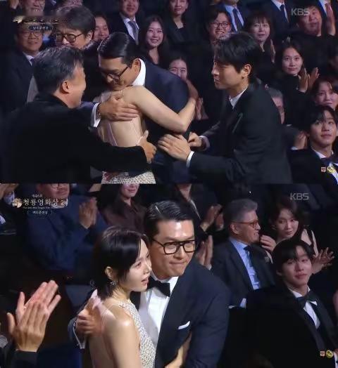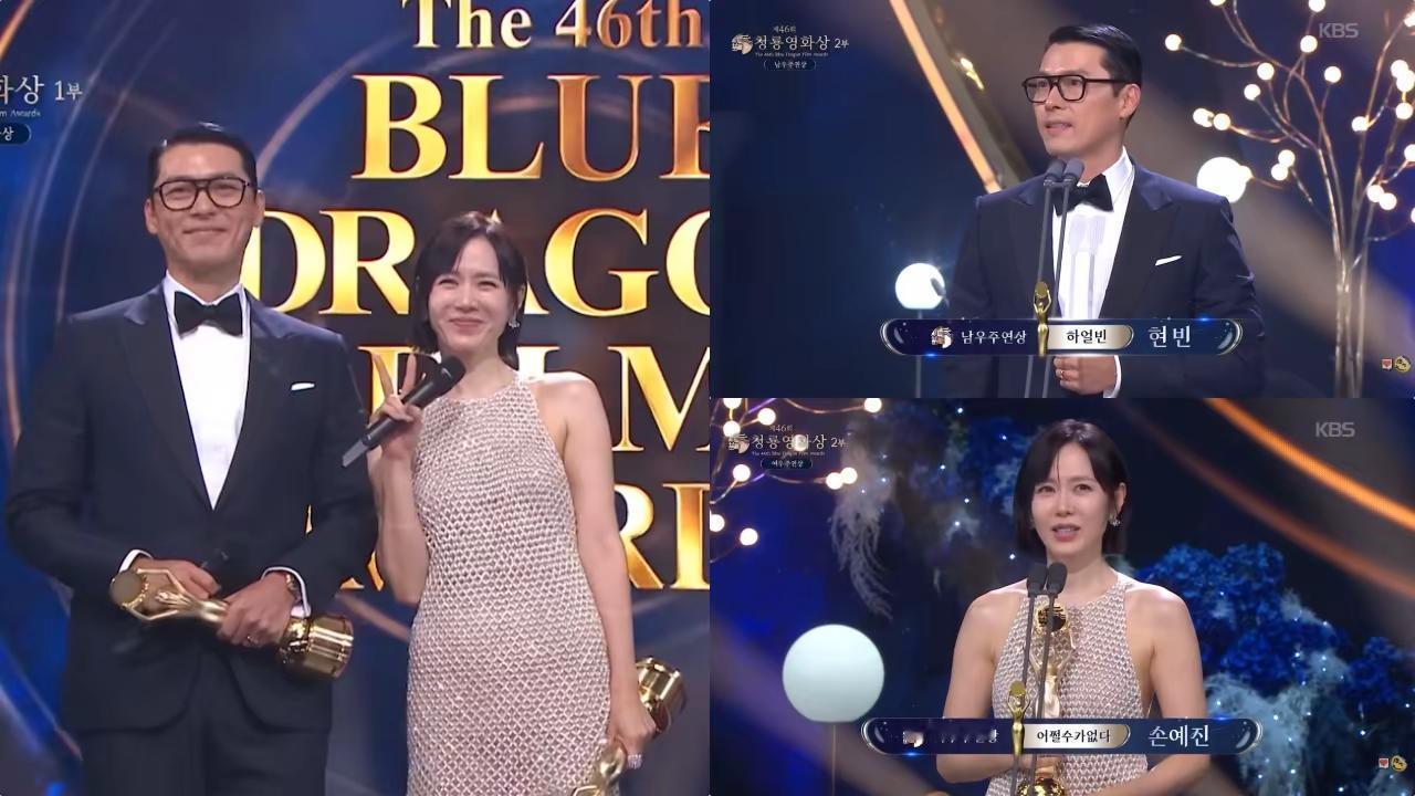玄彬&孙艺真夫妻夺《青龙奖》影帝影后。韩国影坛首例!玄彬&孙艺真夫妻夺《青龙奖》影帝影后,台下拥抱、台上甜蜜放闪♥ 《第46届青龙电影奖》在昨日(19日)举行,玄彬&孙艺真一起登上舞台领人气奖外,还分别夺下影帝与影后,这真的是历史性的场面了 玄彬和孙艺真夫妻先一起登上舞台领人气奖,主持人李帝勋说:「好像是第一次看到夫妻一起上台领奖」时,孙艺真还往玄彬的身旁靠♥ 玄彬说:「这是《爱的迫降》后两人首次一起获奖,来能这样拿著奖一起站在舞台上,果然很幸福。」孙艺真说:「今天对我来说非常难忘,能和新郎一起拿到帅气的人气奖,非常光荣,感谢粉丝和青龙电影奖给我们创造如此难忘的回忆。」 之后,玄彬凭藉电影《哈尔滨》获得最佳男主角奖,他说:「在拍摄《哈尔滨》期间,我感受到比电影更多的感情。我能在这个国家生活并站在这样的位置上,可能是因为很多爲了保卫国家而献身和牺牲的人,我想先向他们表达我的感谢。能够通过电影与观众分享我们应该守护的价值和不应该忘记的历史,感到非常幸福。」 而孙艺真凭藉电影《徵人启弑》获得最佳女主角奖,完美地证明时隔7年的回归作,这也是时隔17年再次获得该奖项。她说:「朴赞郁导演说要一起合作的时候,既高兴又担心,谢谢你把美莉这个角色朔造得这么好。结婚生子后,我感受到了看待世界的眼光正在发生变化,我会成爲好的大人、成爲不断进步的演员。」 当天并排而坐的两人,听到对方获奖时也热烈拥抱。另外,玄彬还说:「还有只是存在就能成爲我的力量的我的妻子艺真、儿子,真的很爱你们,很感谢你们。」孙艺真也说:「最后想和我最爱的两个男人金泰坪(玄彬本名)和我孩子金宇珍一起分享这份喜悦。」 这也让网友纷纷直呼:「怎么这么甜」、「电视剧电影都不敢这么写的剧情,真夫妻同场典礼拿下影帝影后啊」、「我最爱的CP」、「是时侯重看《爱的迫降》了」、「今天真的很幸福」、「历史性的场面了」、「神仙爱情」等等。
