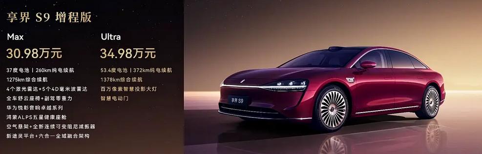 向旗舰看齐 售30.98-36.98万 新款享界S9正式上市 11月20日,鸿蒙智行2026款享界S9正式上市,共推出4款配置车型,售价区间为30.98-36.98万元。 作为改款车型,新款享界S9在外观部分的变化并不大。车头部分最明显的差异在于前盖上原先的纯字母标stelato变成了六边形车标,侧面摄像头的镀铬面积更大。 车身尺寸方面相较于老款也有所调整,长度没变依旧是5160mm,但是宽度从1987mm增加到2005mm,高度1486mm增加到1492mm。 中控屏从15.6英寸扩大到16.1英寸,副驾侧又增加了一块12.3英寸娱乐屏,配置部分看齐享界S9T。如果选装电子后视镜的话,中控台两侧还会额外增加两块屏。 座椅方面,新款享界S9可二选一不同的零重力座椅模式,或是选择后排双零重力座椅,或是副驾零重力,后排用户还能享受到32英寸巨幕投影,搭配25喇叭。 动力依然提供纯电版和增程版两种动力,纯电版搭载800V华为巨鲸电池平台,拥有100度电池包,两驱版CLTC续航816公里,四驱版721公里,30-80最快15分钟。增程版提供37度或53.4度电池包,并匹配1.5T增程器,大电池满油满电1378km。 五档高度可调空悬,连续可变阻尼减振器,支持车位到车位的华为乾崑智驾ADS 4依然是全系标配。 点个关注吧!汽节车社,车圈热点资讯每日一扫清!【来自懂车帝车友圈】