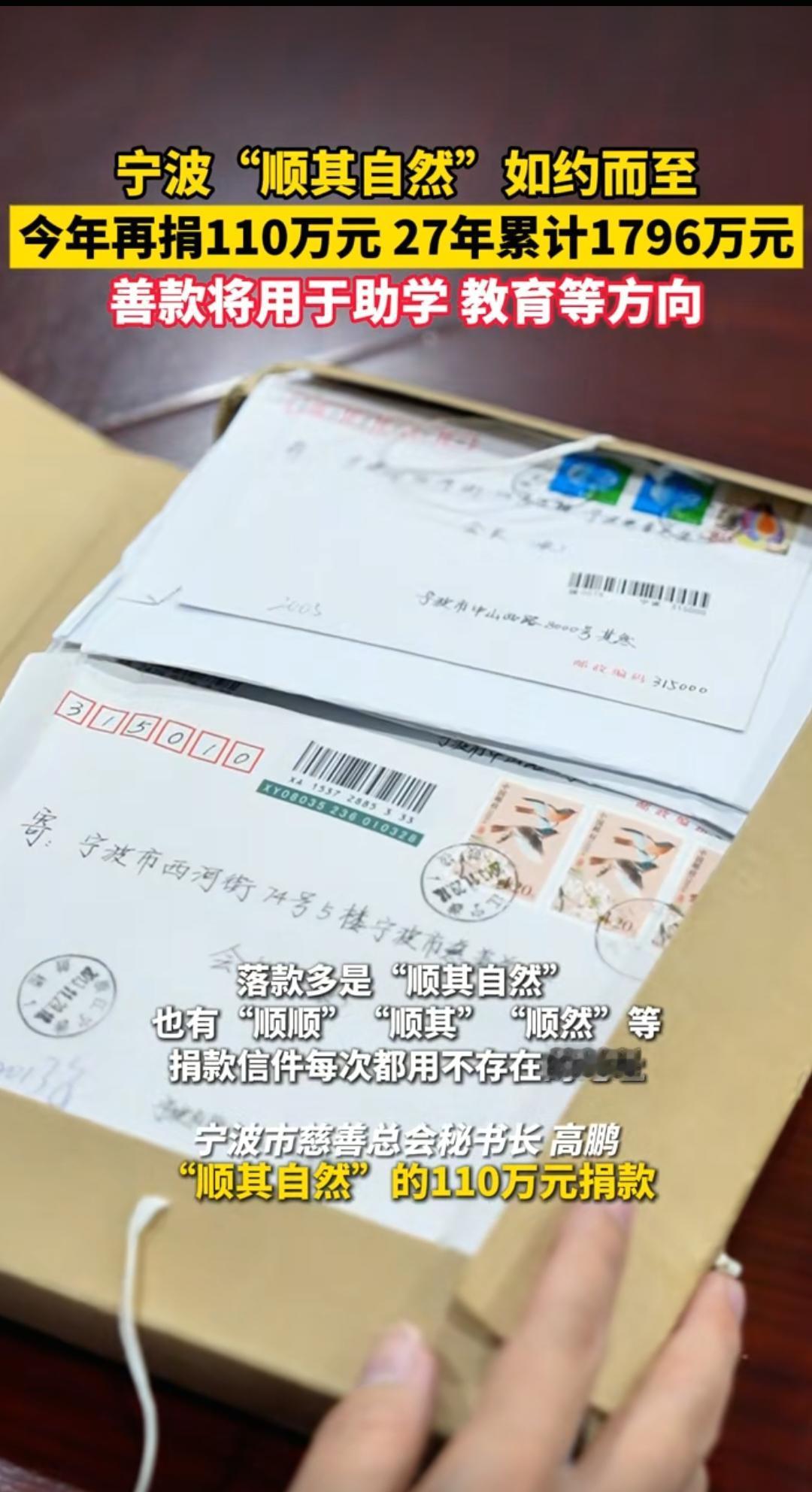 顺其自然今年又捐款110万!连续27年捐款1796万! 顺其自然是一个极其神秘的人物,每年都会在大概的时间节点向宁波市慈善总会寄来捐款的信,而且每次都会使用顺其自然这4个字随意组成的名字,并且他(她)所留的地址都是现实中并不存在的。 考虑到顺其自然已经连续27年捐款了,那么他(她)的年龄不会太小,如果18岁捐款的话那么今年也有45岁。 网友能够从顺其自然捐款的金额上看出顺其自然,近几年的生意怎么样,今年捐款再次高达110万。也祝愿顺其自然身体康健,生意越做越好。 各位是怎么看的?欢迎评论区留言。