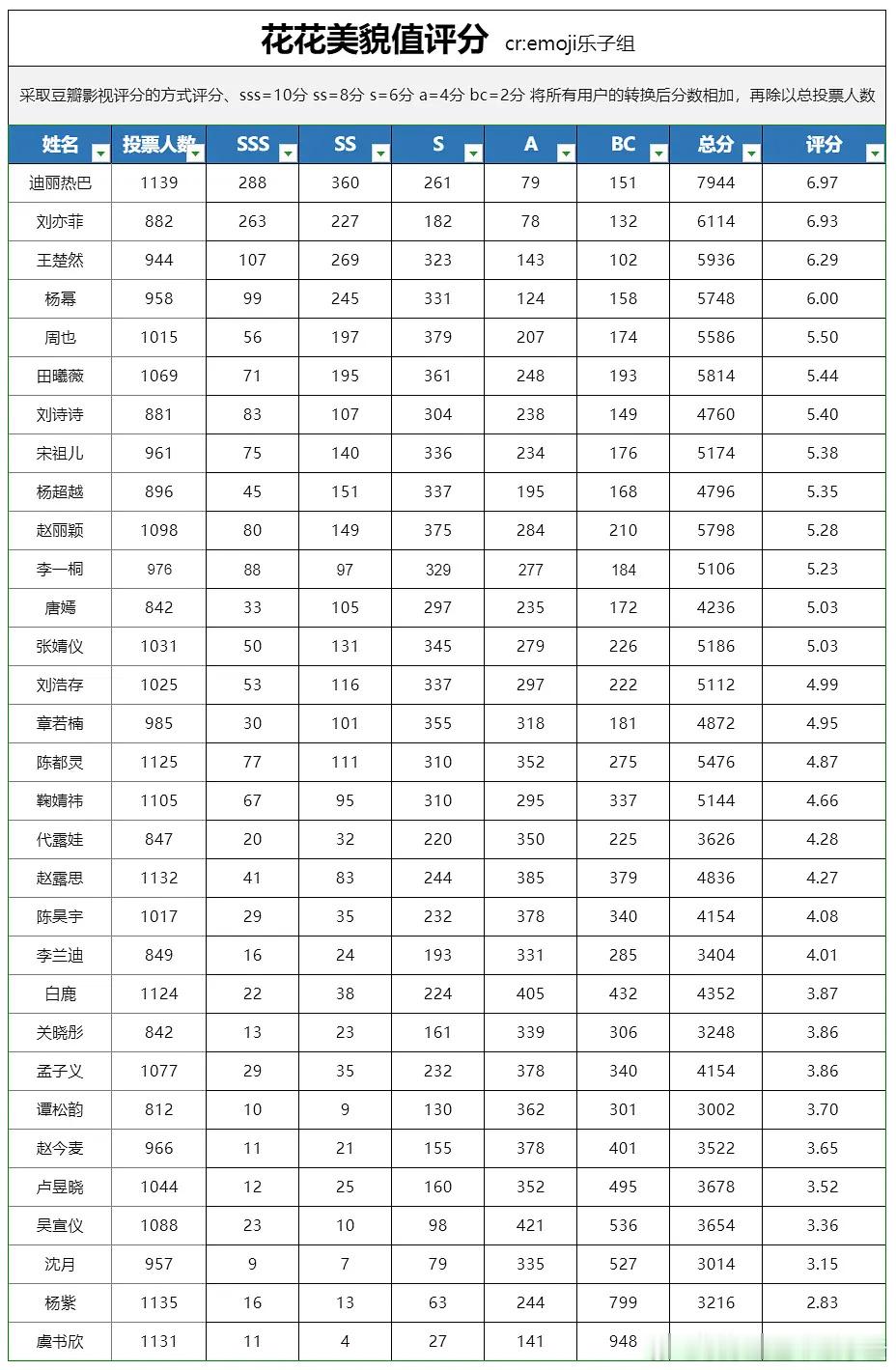 豆瓣花花美貌评分拉表Top10:迪丽热巴 刘亦菲 王楚然 杨幂 周也 田曦薇 刘诗诗 宋祖儿 杨超越 赵丽颖